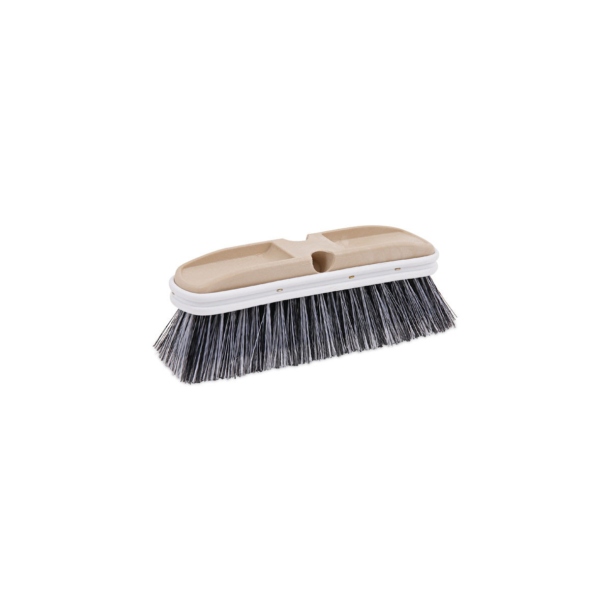 Thoroughly clean your vehicles with care. Constructed of a 2.5" wide flow-through, plastic block with two holes for multiple handle compatibility. Compatible with 1 1/8" diameter tapered or threaded end handles, which are sold separately. The vinyl bumper protects vehicle finish from dents and scratches. Self-flagged polystyrene bristles for soft yet effective scrubbing.