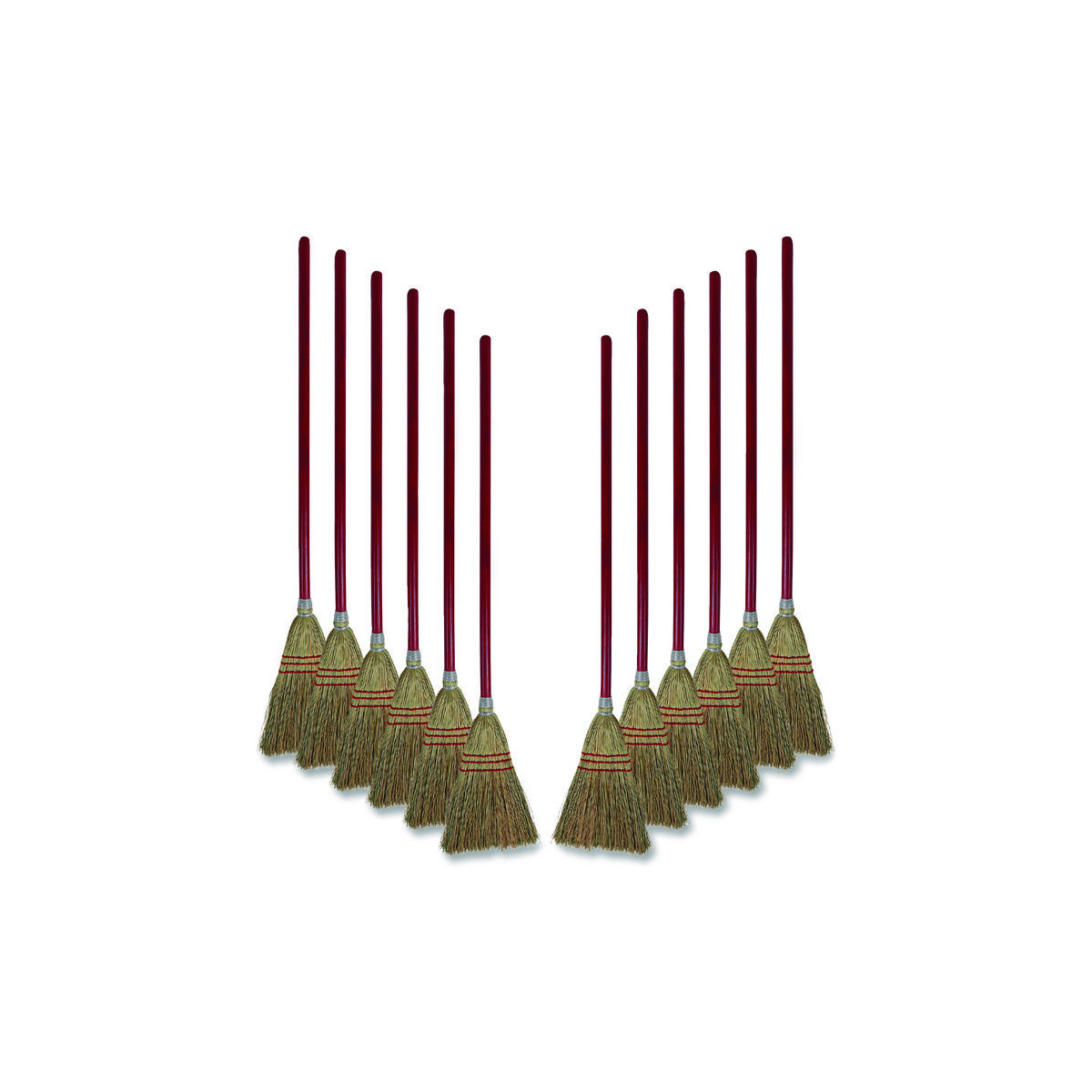 Economy and performance are hallmarks of this upright, corn fiber broom. Bound with double-stitched nylon cord for durability. Constructed with stiff, natural, corn fiber bristles that are tightly secured to the handle with a heavy, metal wire. Durable upright broom can tackle routine cleaning jobs and tucks away for easy storage with its shorter handle. An ideal, sturdy broom for sweeping concrete and other rough floor surfaces. Solid wood handle that's lacquered to prevent splintering and blistering. Three rows of stitching for lasting use.