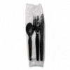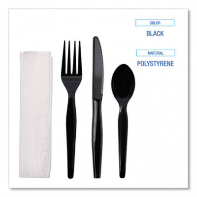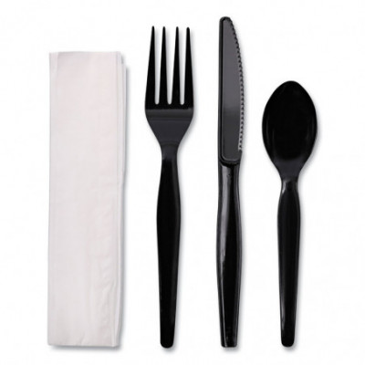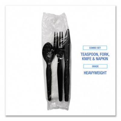 Four-Piece Cutlery Kit, Heavyweight, Fork/Knife/Napkin/Spoon, Plastic, Black, 250/Carton