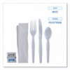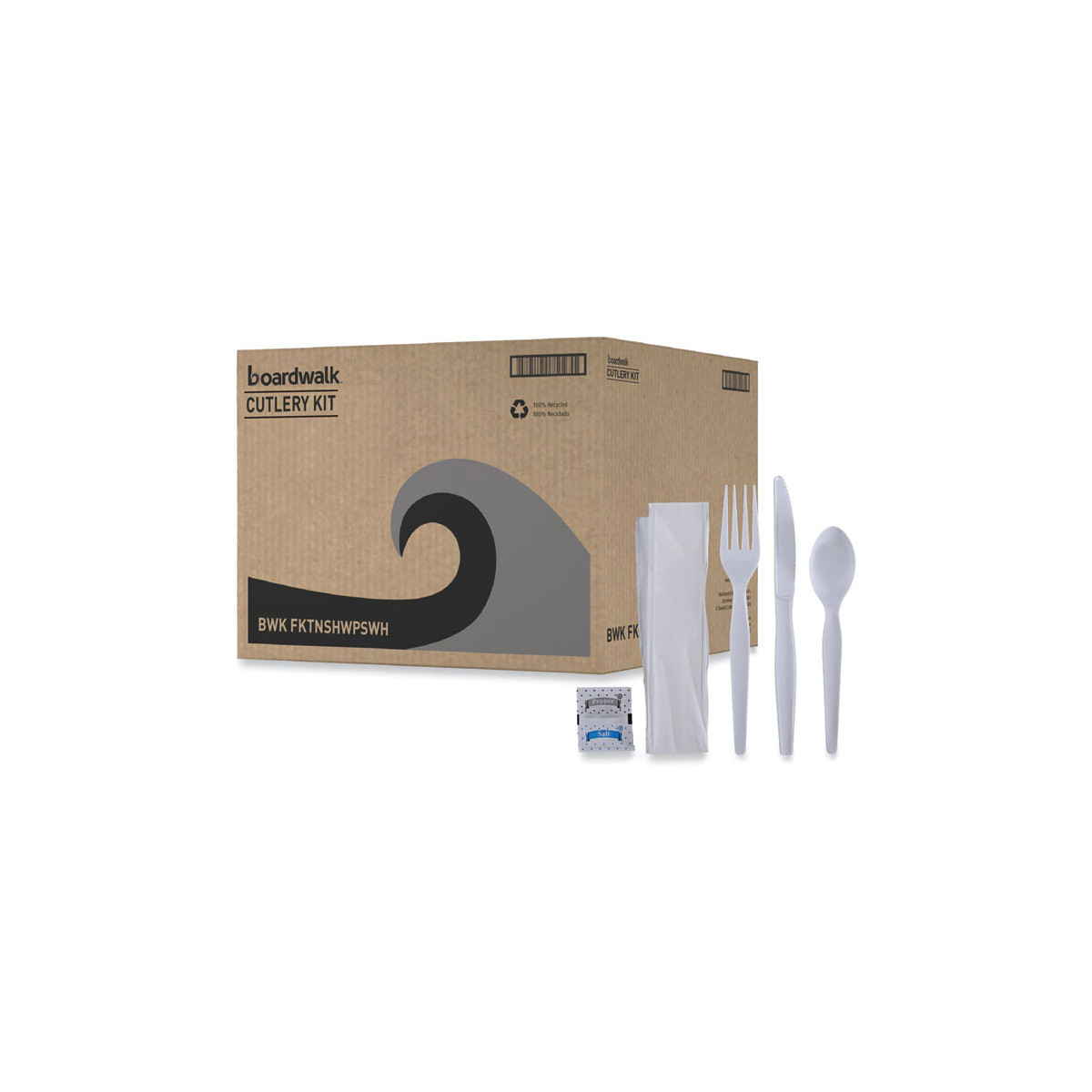 Six-Piece Cutlery Kit, Heavyweight, Fork/Knife/Napkin/Pepper/Salt/Spoon, Plastic, White, 250/Carton