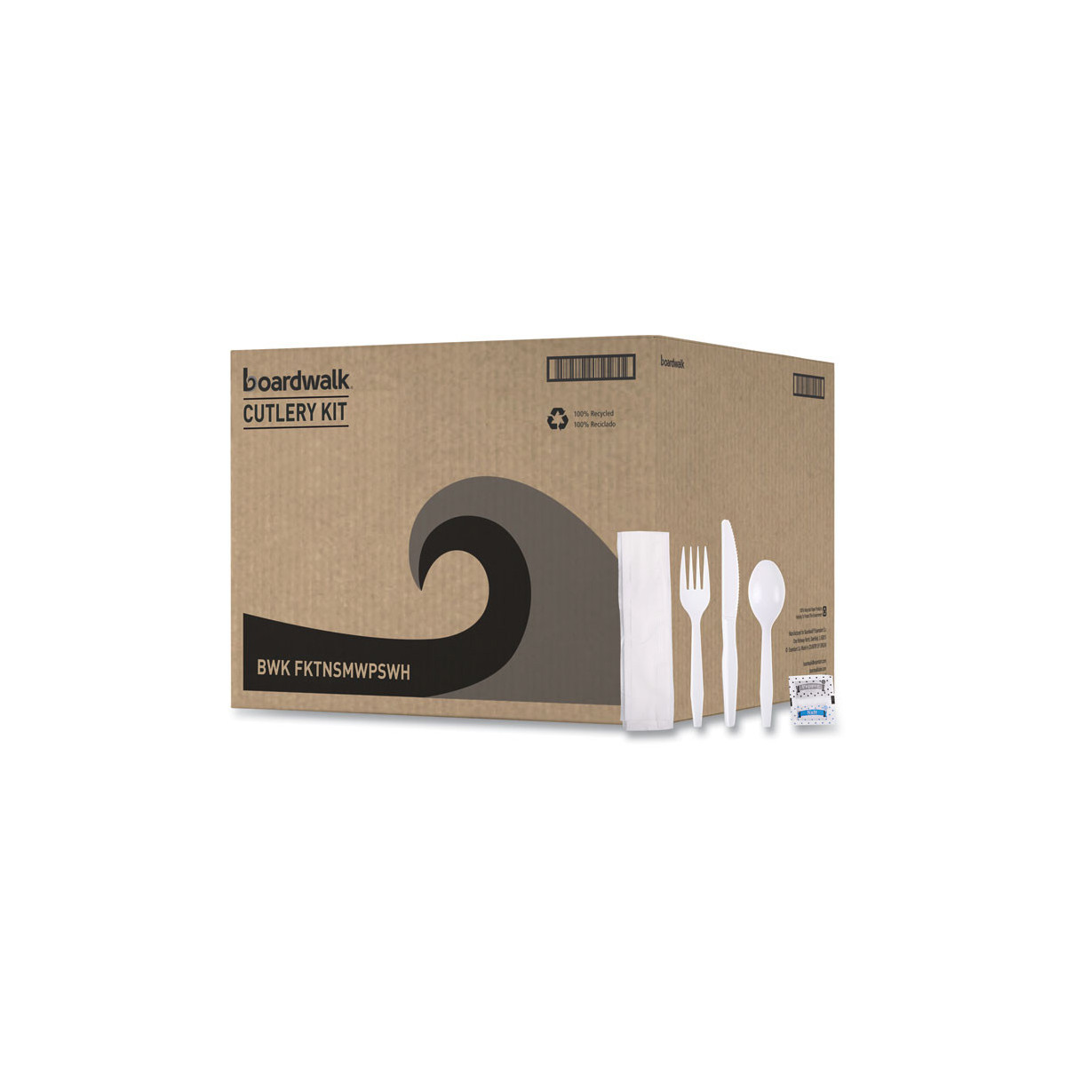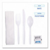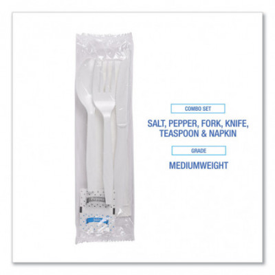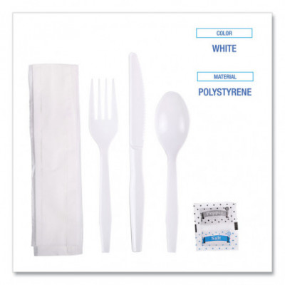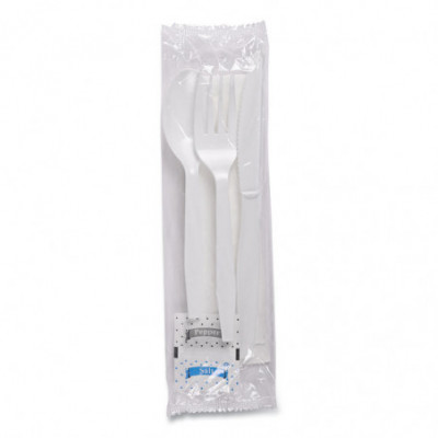 Six-Piece Cutlery Kit, Mediumweight, Fork/Knife/Napkin/Pepper/Salt/Spoon, Plastic, White, 250/Carton