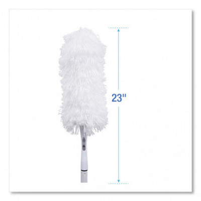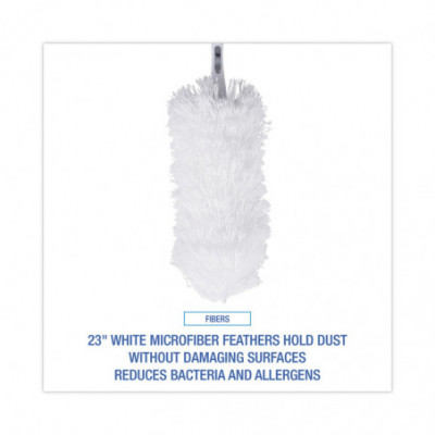 Apply microfiber feather technology to every hard-to-reach dusting job with the softest touch and toughest dust-grabber in the industry. Tiny microfiber hooks grab and hold dust particles without damaging sensitive surfaces. Ultra lightweight and dusts without chemicals. Reduces bacteria and allergens. Flexible wire core head allows duster to fit in tight areas. Easily remove duster head for handwashing. End of handle is fitted with standard threads to accommodate Boardwalk® telescopic handle (sold separately).