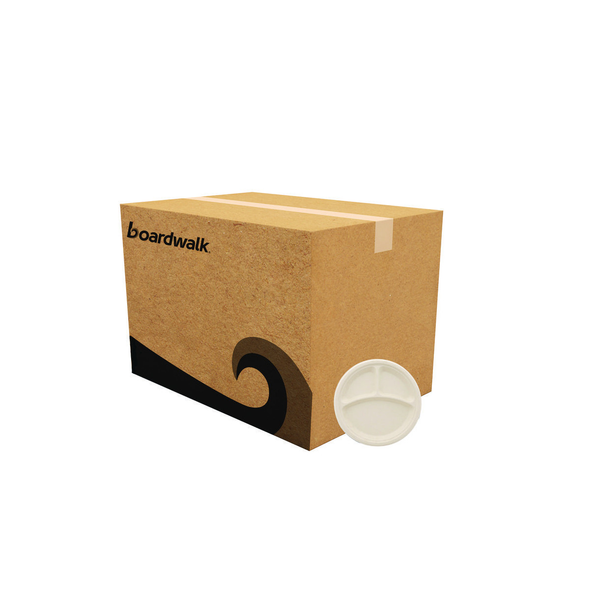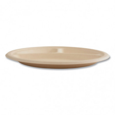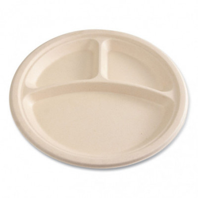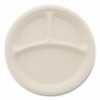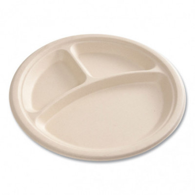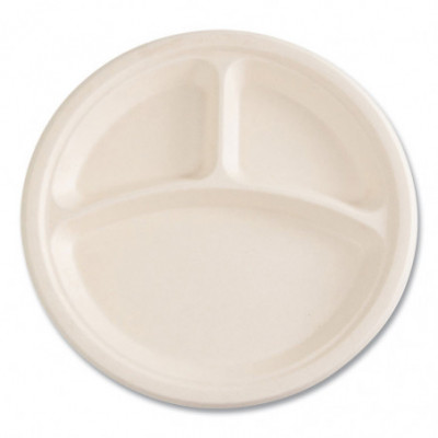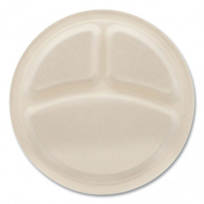 Bagasse PFAS-Free Dinnerware, 3-Compartment Plate, Sugarcane, 10" dia, Tan, 500/Carton