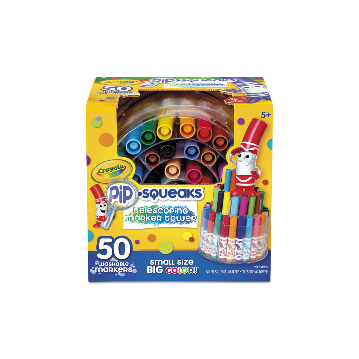 The Crayola Pip Squeaks Marker Tower boasts small size but big color! Little hands will love Pipsqueaks Markers for drawing, coloring, and creating one of a kind art projects! Doubling as both a display and storage case, this marker set lets you show off your drawing supplies to friends. Perfect for coloring books and crafts for kids, these washable markers won't bleed through the page.