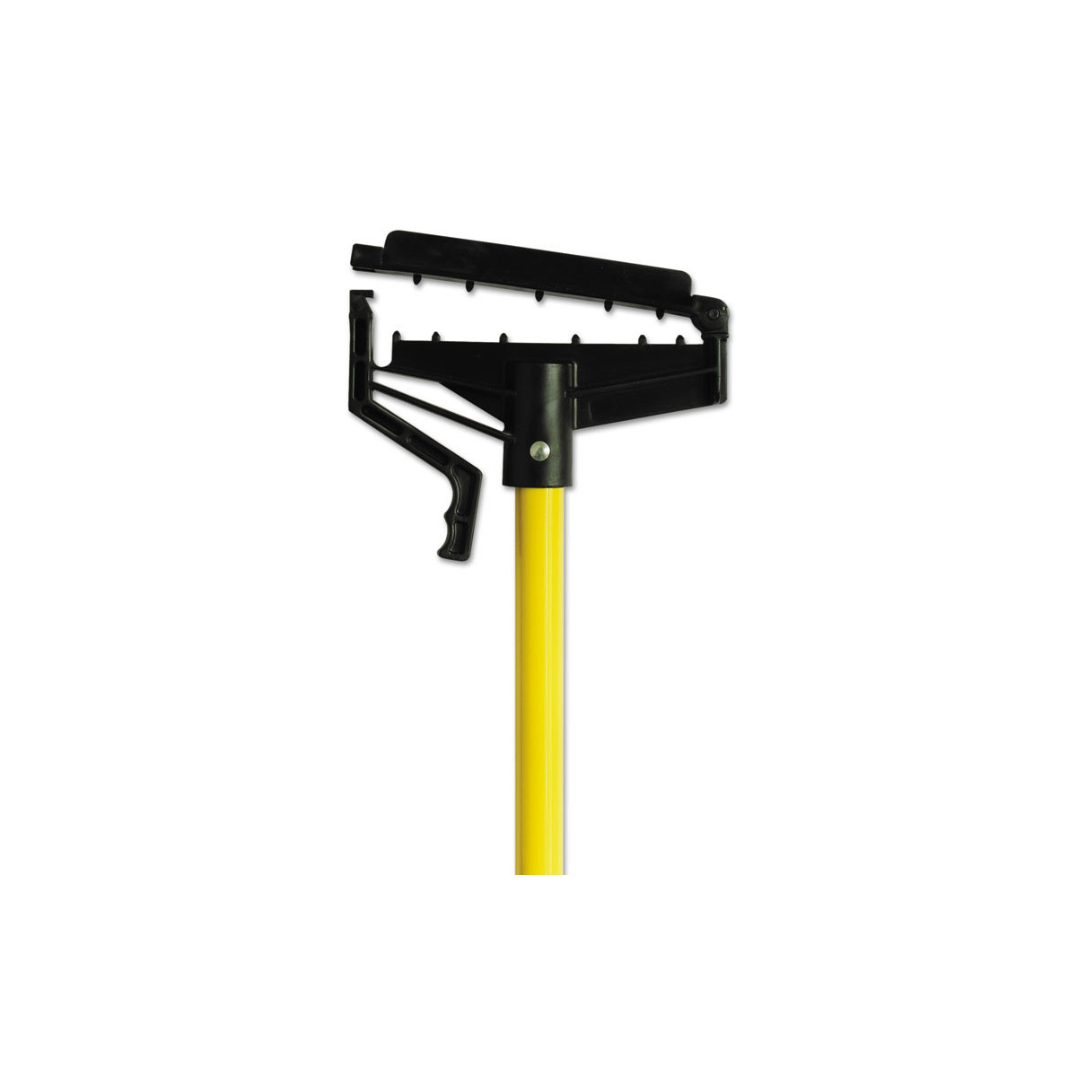 Make everyday cleaning quick and easy, with an extremely durable, yet lightweight, quick-change mop handle. Heavy duty sanitary black plastic frame with easy trigger release allows you to quickly discard a soiled mop without touching it. Fiberglass handle is easy to sanitize.