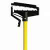 Quick-change mop handle is extremely durable, yet lightweight for easy use. Heavy duty sanitary black plastic frame with easy trigger release allows you to quickly discard a soiled mop without touching it. Fiberglass handle is easy to sanitize.