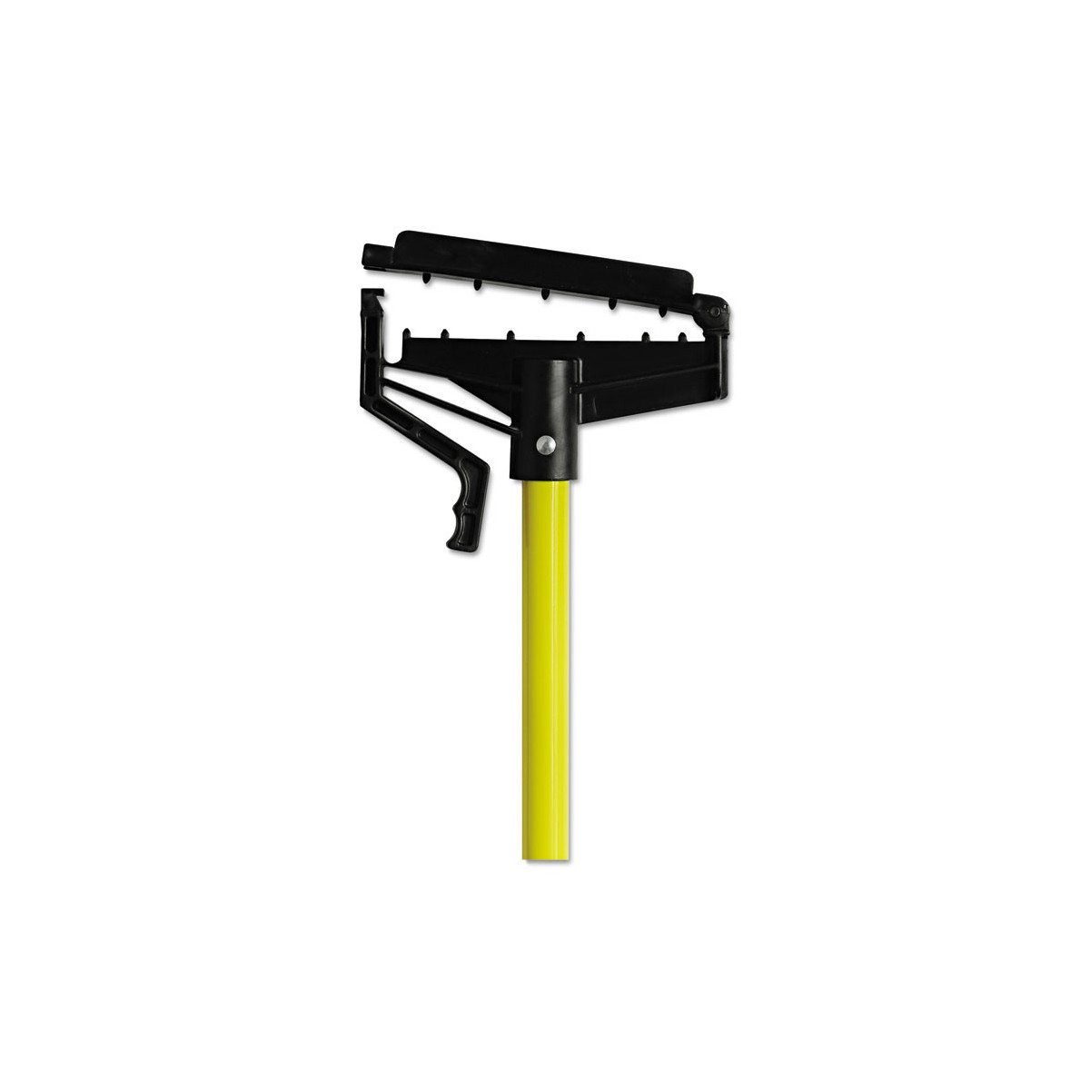 Quick-change mop handle is extremely durable, yet lightweight for easy use. Heavy duty sanitary black plastic frame with easy trigger release allows you to quickly discard a soiled mop without touching it. Fiberglass handle is easy to sanitize.