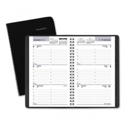 Includes printed monthly indicators to quickly find the date you need. Quarter-hourly appointment increments. Includes a double-sided storage pocket. Durable black embossed simulated leather cover will endure frequent daily use. Strong wire binding to keep pages in place. Made entirely of recycled materials.