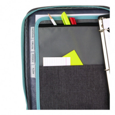 Carry it all in one convenient, zippable spot! Lasts all year! Guaranteed! Carry-all binder is made of durable polyester to withstand daily use. Four tabbed dividers allow you to store papers and organize them by subject. The removable ring board provides a portable writing surface. Full sized pocket inside of the binder easily stores notes and handouts. 1" binder holds up to 375 sheets, when using 15-lb filler paper. Three O-rings allow for increased paper storage and keep 3-hole punched sheets securely in place. Exterior pockets for quick access to papers and supplies. Available in Gray/Mint, Olive/Peach, Black/Gray and Navy/Blue. Color chosen for you.
