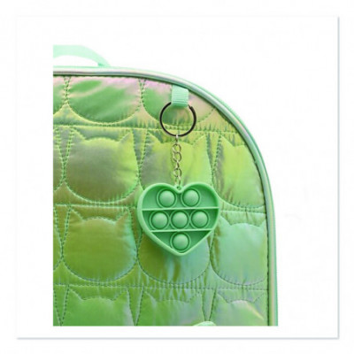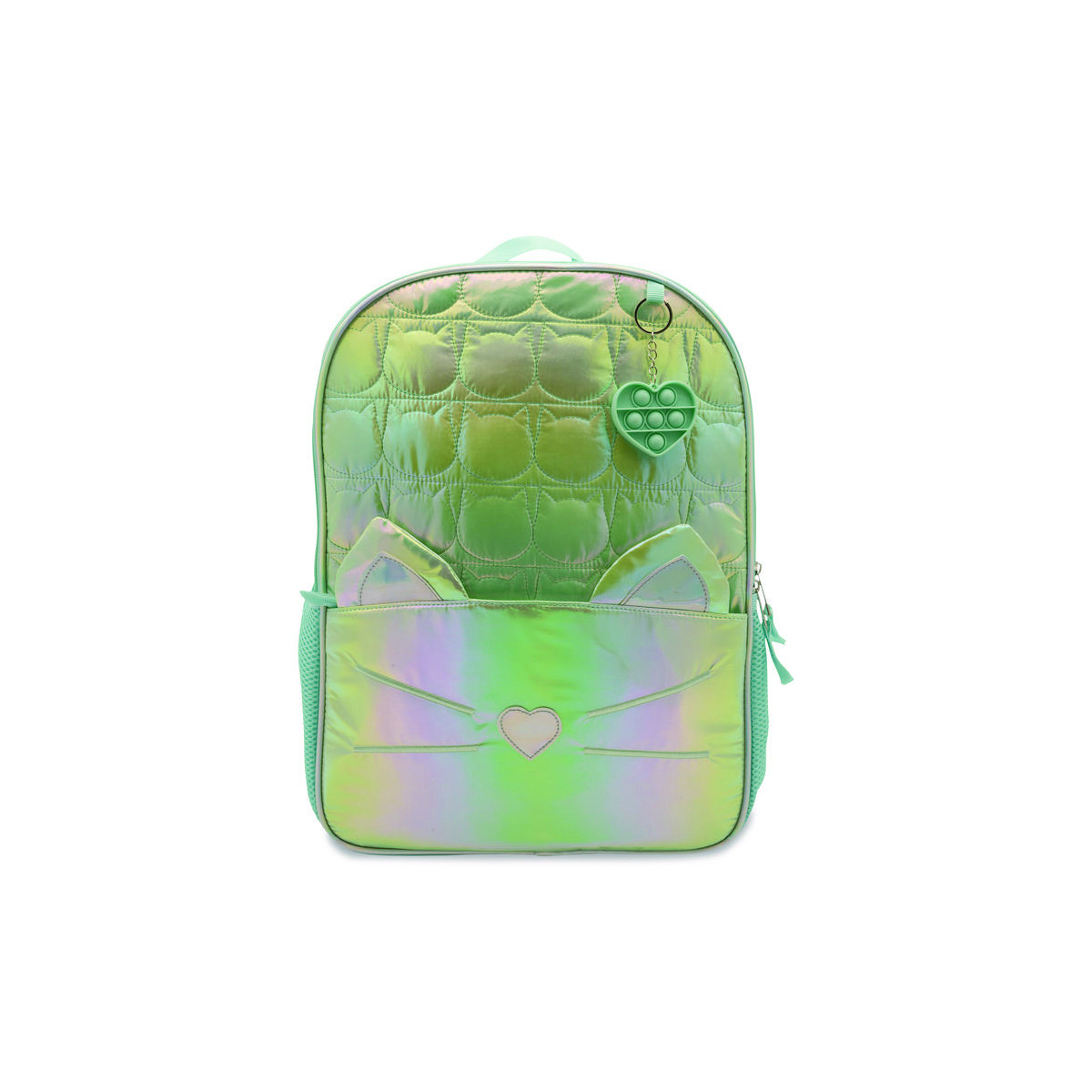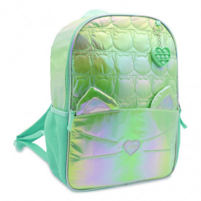 Great for back to school and beyond, the Iridescent Cat Backpack features a whimsical design with 3D poly-nylon cat ears, 3D PU nose and embroidered whiskers that cat lovers find adorable. And whether you have books or personal belongings, its quilted shell, padded back and padded adjustable shoulder straps make it a pleasure to carry. Two mesh side pockets and one front zip pocket keep important items and school supplies close. Includes a color-coordinated, pop-heart key chain.
