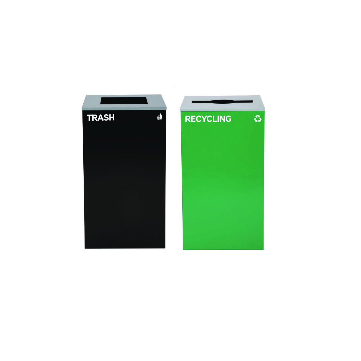 Set of 2, 29 gal Cans-Includes one green Recycling Can with Mixed Lid and one black Trash Can with Square Lid.
