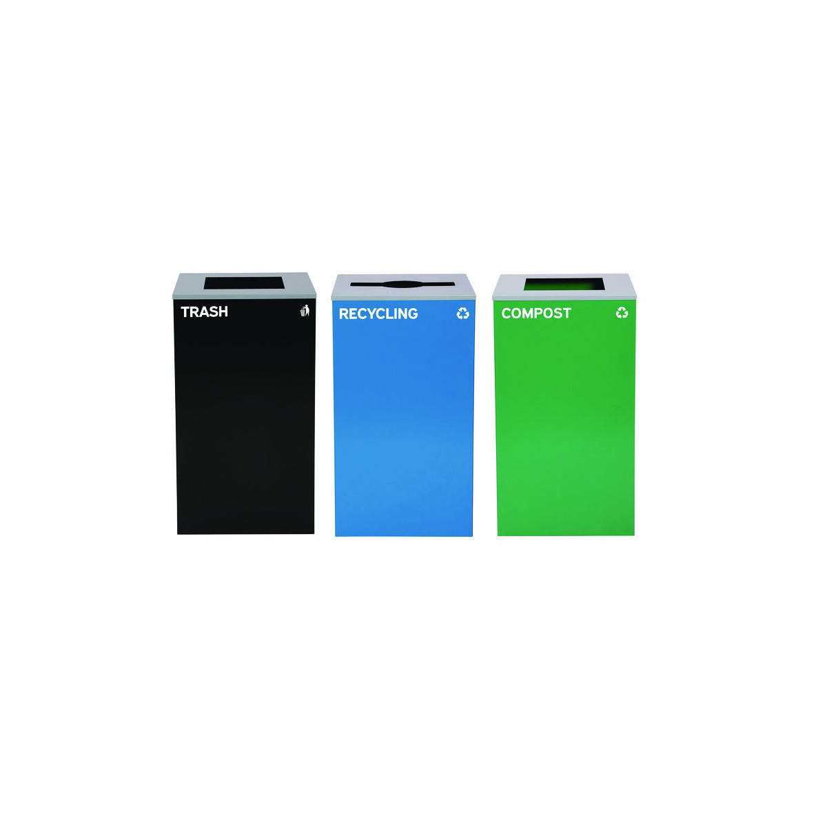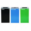 Set of 3, 29 gal Cans-Includes one blue Recycling Can with Mixed Lid, one green Compost Can and one black Trash Can with Square Lids.