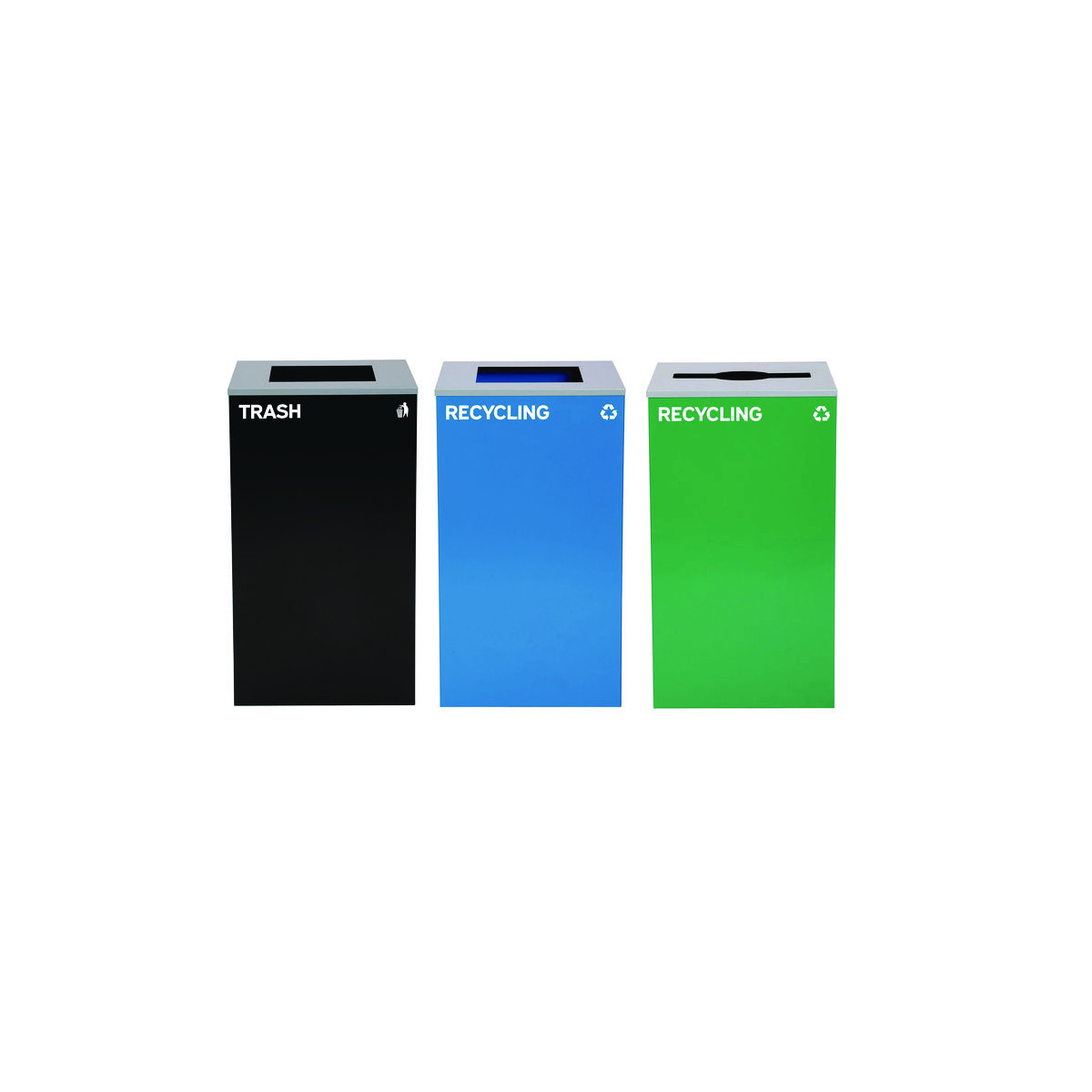 29 Gallon Trash/Recycling Cans, Steel, Blue Recycling Can and Black Trash Can w/Sq Lid, Green Recycling Can with Mixed Lid