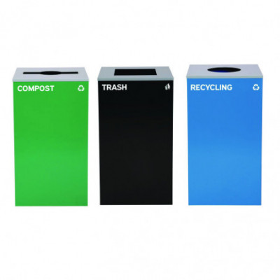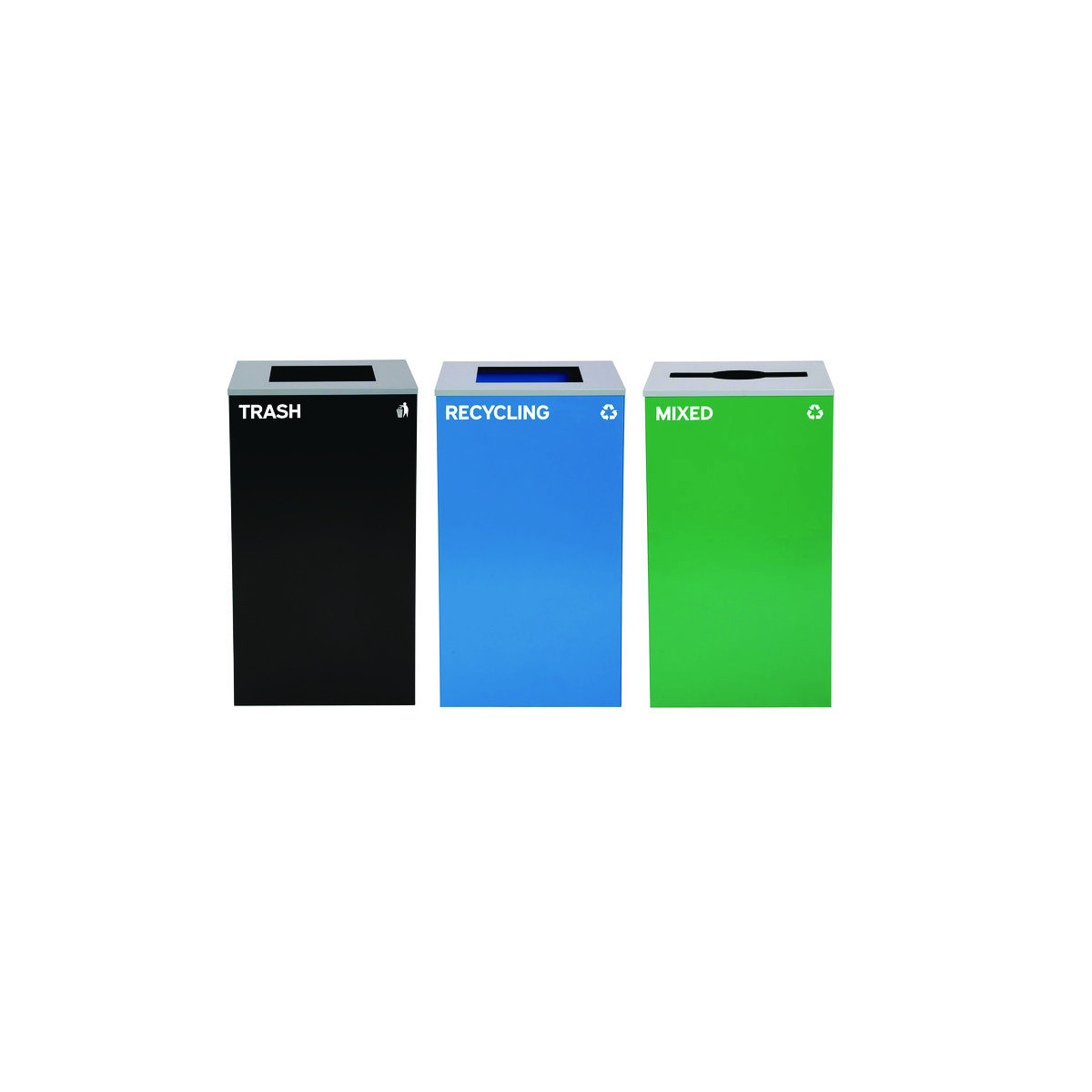 Set of 3, 29 gal Cans-Includes one blue Recycling Can with Square Lid, one green Mixed Recycling Can with Mixed Lid and one black Trash Can with Square Lid.