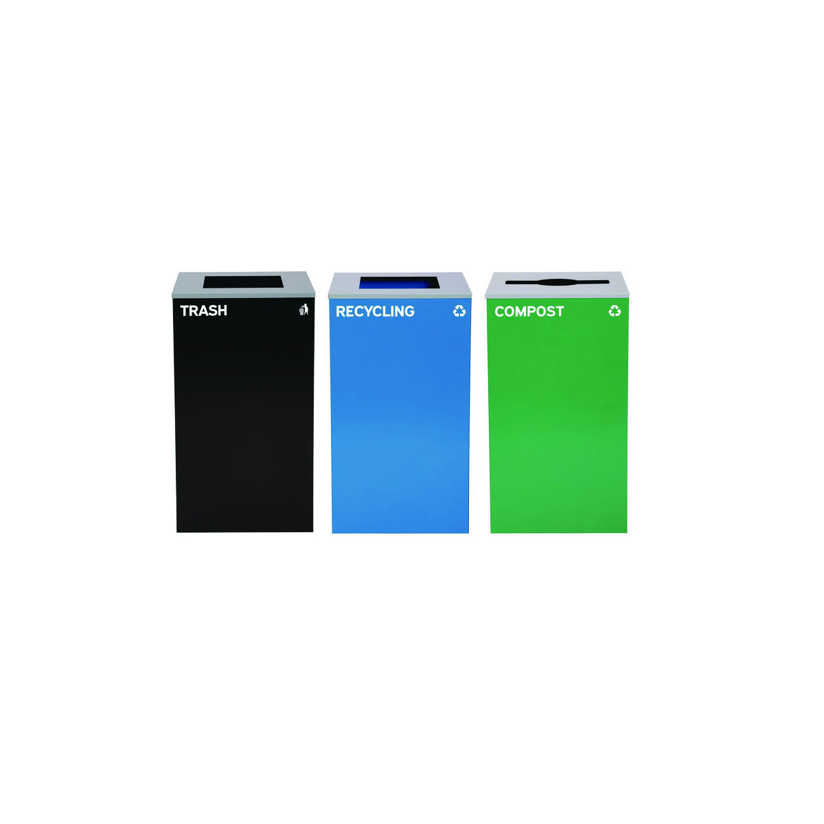 Set of 3, 29 gal Cans-Includes one blue Recycling Can with Square Lid, one green Compost Can with Mixed Lid and one black Trash Can with Square Lid.