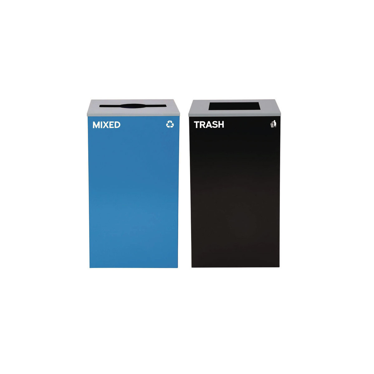 Set of 2, 29 gal Cans-Includes one blue Mixed Recycling with Mixed Lid and one black Trash Can with Square Lid.