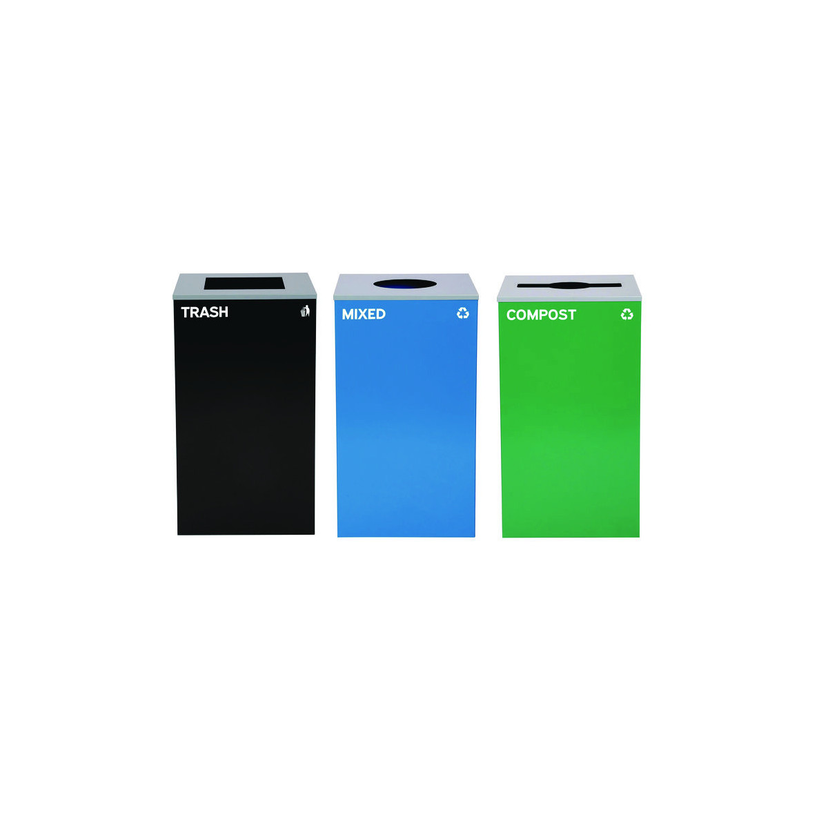 Set of 3, 29 gal Cans-Includes one blue Mixed Recycling Can with Circle Lid, one green Compost Can with Mixed Lid and one black Trash Can with Square Lid.