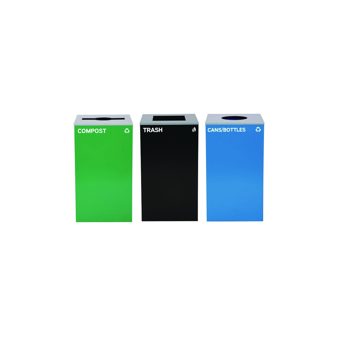 Set of 3, 29 gal Cans-Includes one blue Cans/Bottles Recycling Can with Circle Lid, one green Compost Can with Mixed Lid and one black Trash Can with Square Lid.