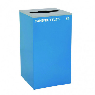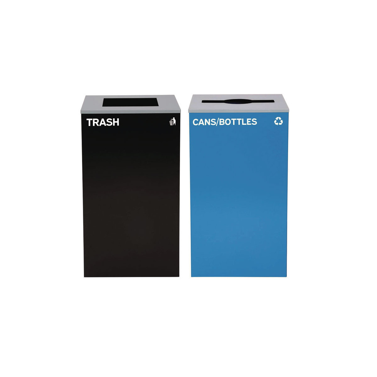 Set of 2, 29 gal Cans-Includes one blue Cans/Bottles Recycling with Mixed Lid and one black Trash Can with Square Lid.