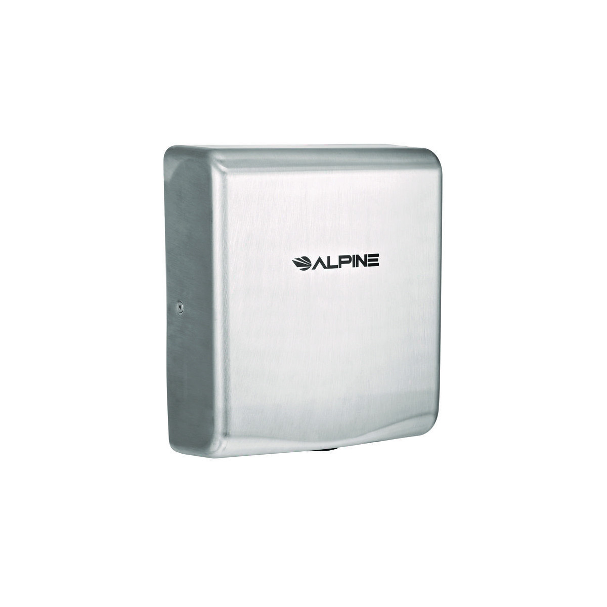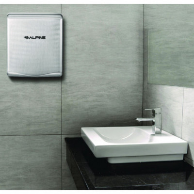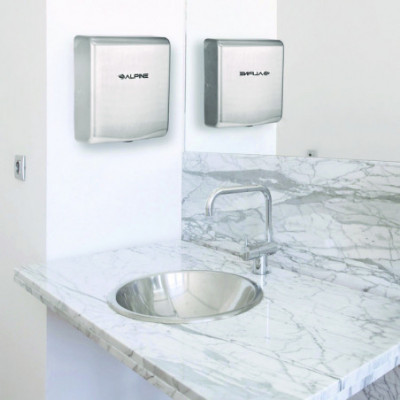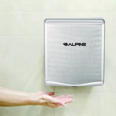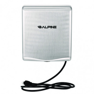 The Alpine Industries Willow Commercial Automatic Electric Hand Dryer is a high-speed automatic hand dryer with a unique design offering a blue light for hand drying efficiency. A HEPA filter cleans bacteria from intake air and the dryer is even equipped with a heat and speed control. With a less than 4" depth, this hand dryer is ADA-compliant without the need of a recess kit. With a powerful 32,000 RPM motor, the Willow model will dry your hands in 10 seconds, faster than many comparable high-speed hand dryers and excellent for high-traffic bathroom areas. Saving thousands of dollars per year in paper towels and electricity, the Willow hand dryer is also equipped with a plug-in option for quick and easy installation. Hand dryer automatically activates when hands are placed beneath the sensor and stops when they are removed. Also features auto-stop function if hands are not removed after 63 seconds.