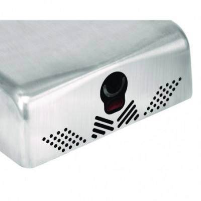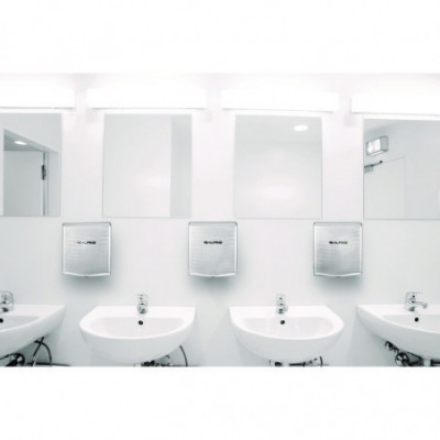 High speed automatic hand dryer with a unique design offering a blue light for hand drying efficiency, HEPA filter to clean bacteria from intake air, and is even equipped with a heat and speed control.