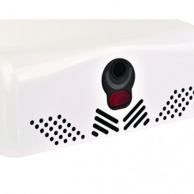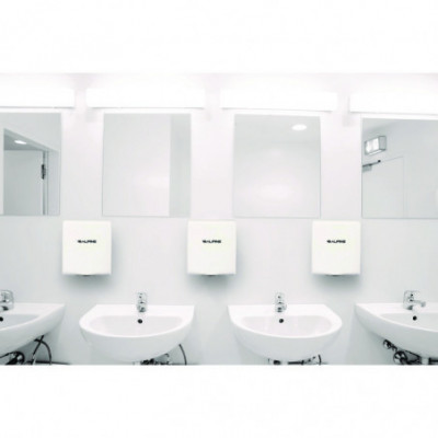 High speed automatic hand dryer with a unique design offering a blue light for hand drying efficiency, HEPA filter to clean bacteria from intake air, and is even equipped with a heat and speed control.