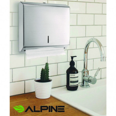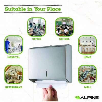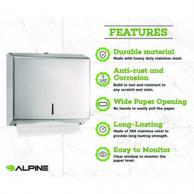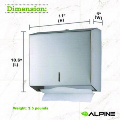 The Alpine Industries C-Fold/Multi-Fold paper towel dispenser is ideal for high traffic restrooms, break rooms, food service facilities, health-care facilities and more. Made of durable stainless steel with a brushed finish and features a lock to help prevent tampering and vandalism. The dispenser features a sight window on the front to monitor fill levels. The paper towel dispenser can easily be mounted to any wall or surface. A slanted top adds style, while preventing it from being used as a shelf and ensuring long-term use.