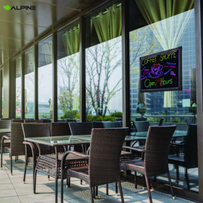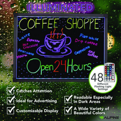 The Alpine LED Message Board features a neon notice sign with 48 different flashing display styles. With a panel made of high-quality tempered glass fitted in a durable aluminum frame, you are destined to get the most out of your purchase. This message board is designed to be stationed outside of a restaurant or similar venue. Use it to guide your customers towards promotional merchandise and price specials, announce the daily menu at your restaurant, advertise the release of new items, and notify your participants about upcoming parties. The Message Board package includes power adapter, eight colored marker pens, remote control, erasing towel, hanging chain and a clear User's Manual. The sign is easy to use right out of the box. Just attach the chain to the rings as seen in the User's Manual, plug it in and use the button on the adapter or the remote control to maneuver between flashing functions. Prior to using of the markers for the first time, shake it well for several times while capped, until the nib turns sodden by the color of the ink. While shaking, the marker can shed ink droplets causing damage to clothing. Keep capped until ready for use.