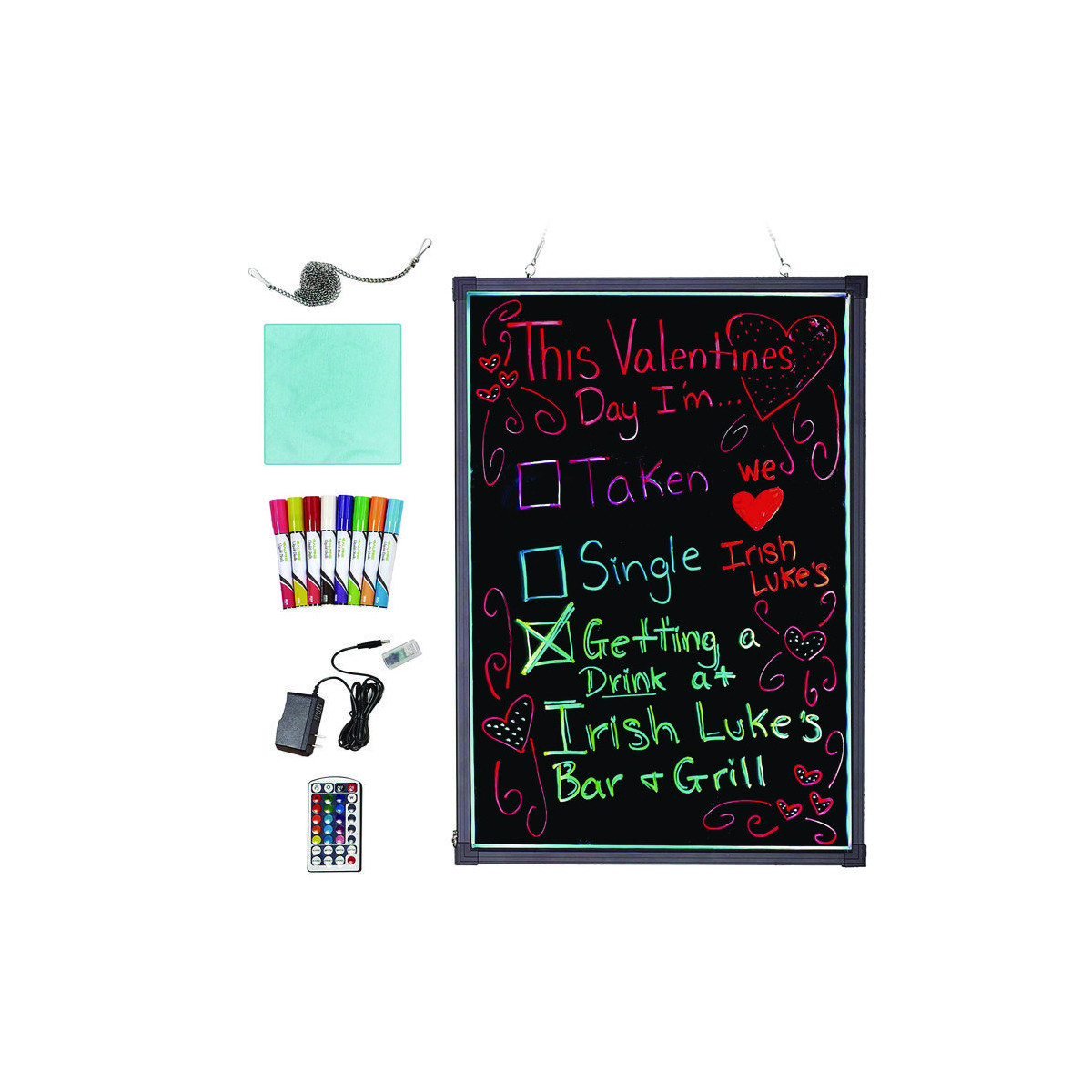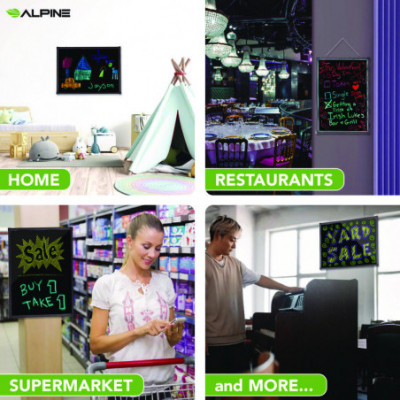 The Alpine LED Message Board features a neon notice sign with 48 different flashing display styles. With a panel made of high-quality tempered glass fitted in a durable aluminum frame, you are destined to get the most out of your purchase. This message board is designed to be stationed outside of a restaurant or similar venue. Use it to guide your customers towards promotional merchandise and price specials, announce the daily menu at your restaurant, advertise the release of new items, and notify your participants about upcoming parties. The Message Board package includes power adapter, eight colored marker pens, remote control, erasing towel, hanging chain and a clear User's Manual. The sign is easy to use right out of the box. Just attach the chain to the rings as seen in the User's Manual, plug it in and use the button on the adapter or the remote control to maneuver between flashing functions. Prior to using of the markers for the first time, shake it well for several times while capped, until the nib turns sodden by the color of the ink. While shaking, the marker can shed ink droplets causing damage to clothing. Keep capped until ready for use.