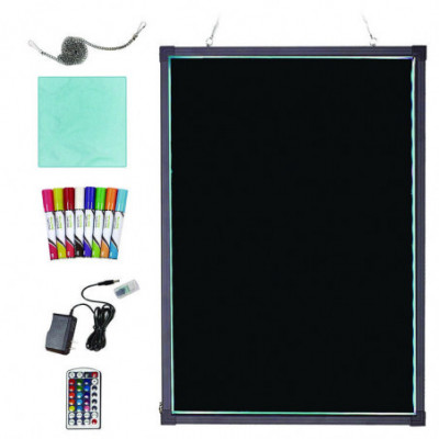 This LED illuminated hanging message writing board features a glowing neon notice sign with 48 different flashing display styles. With a main panel made of high-quality tempered glass fitted in a durable aluminum frame, this LED writing board meant for outdoor restaurant or venue advertising.
