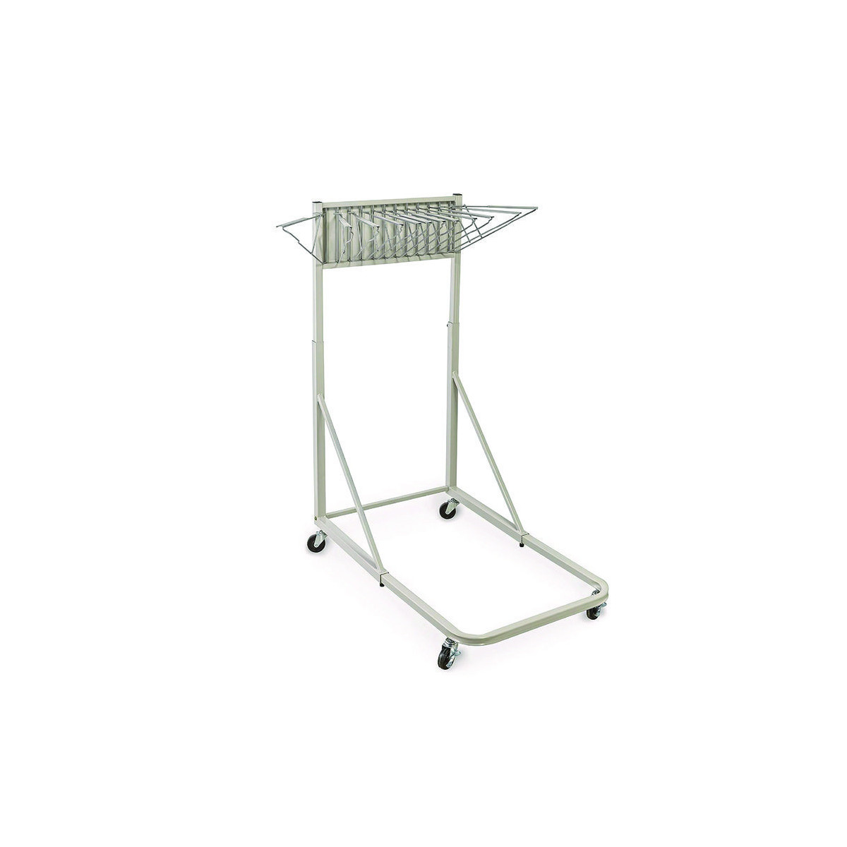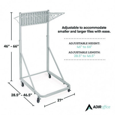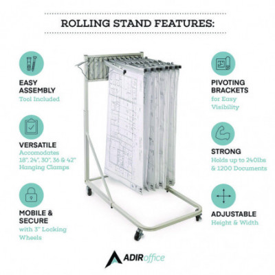 The AdirOffice Vertical File Rolling Stand with 12 Brackets provides hanging blueprint storage that's convenient and easy to get to. The 12 pivot brackets swing out wide so it's a cinch to see and access your blueprints, plan drawings, maps, or other large documents. Just clamp your files into a hanging paper clamp (sold separately) and snap it onto one of the brackets. The brackets accommodate any size clamp, so you can fit documents in a variety of sizes onto this mobile blueprint stand at the same time. This mobile blueprint rack is adjustable to fit even your largest files. Made of solid steel, with a 240 lbs weight capacity (20 lbs per bracket), this hanging file rack can hold a lot of documents. It's easy to move your documents from room to room on this mobile plan rack, which has four 3" swivel wheels. The front two lock to hold it stable when you get it to its destination. Will accommodate all hanging clamps between 18", 24", 30, 36 and 42. (Clamps sold separately.)