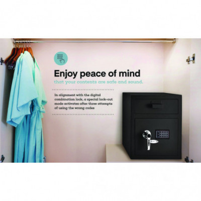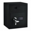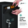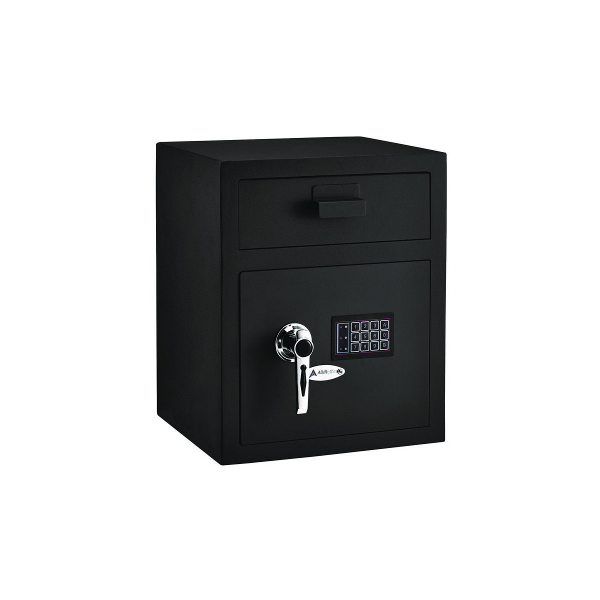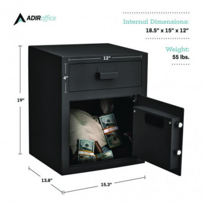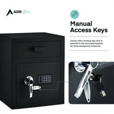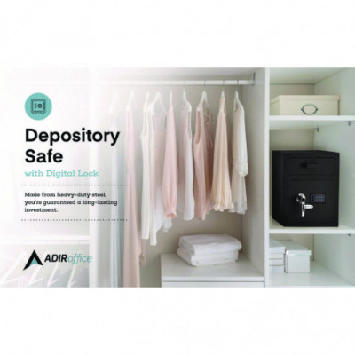 Ideal for home and business use, the AdirOffice Digital Depository Safe ensures that the contents inside are safe and secure to give users peace of mind. End your worries about keeping cash, jewelry, important documents and other valuables safe on a temporary or permanent basis. Built using rugged, steel construction, this safe offers reliability and long-lasting strength for years to come. The inside is furnished with, a soft carpeted floor to add an extra layer of protection, ensuring jewelry, heirlooms and other delicate items are safeguarded against scratches or damage. The Adir is equipped with an electronic lock and comes with four AA batteries for quick set-up and easy operation. Select your own access codes and change them at will as an ideal feature for guests at lodging establishments or businesses dealing with large amounts of cash on a regular basis. In addition to the electronic lock, the safe features two deadbolt door locks for added security and a lock-out mode that activates after three attempts of entering the wrong codes. These relevant elements help prevent intruders from getting inside to keep your most precious valuable safe when you're not around. Unlike similar safes, the AdirOffice safe has a secure bin door that serves as a drop box. This convenient feature allows you to make deposits in a hurry without having to open the secured compartment, particularly useful for individuals carrying around large sums of money at work. In emergencies, authorized users can use the supplied keys to access the compartment via a concealed keyhole if they forget the passcode or if the keypad batteries run out. To make it complete, a black exterior finish furnishes a handsome look that will seamlessly fit into any home or business space.