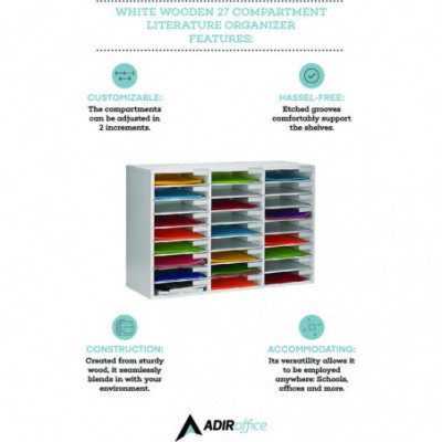 Life is crazy and messy, but you can help yourself, staff, and students stay as organized as possible with our Wooden 27 Compartment Literature Organizer. Its versatility allows it to be employed anywhere, such as at school, offices or daycares. Created from sturdy finished wood material, the contemporary literature organizer will seamlessly blend into your room and outlast cheap cardboard alternatives. Our customizable organizer can be adjusted in 2-inch increments, accommodating a variety of items you need to store. With no pesky wooden pegs to adapt to the perfect size, you can effortlessly change each shelf firmly supported by grooves etched in the wood. It can hold papers, files, or even larger items like art projects, office supplies and binders. Each shelf is constructed from durable MDF; so, you can be assured it will firmly hold your items. These compartments are also perfect for name tags or labels so that you can assign slots by a person's name, project or date. Time is of the essence; thus, we designed our organizer for easy assembly, with minimal hardware that will not stagger over time. When you buy our Wooden 27 Compartment Literature Organizer, you're getting a long-lasting product that will help maintain order and locate essential items immediately.