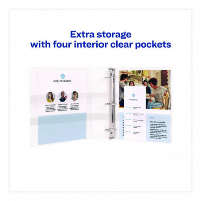 EZD® rings provide an increased capacity when compared to the same size slant or round rings. Tear-resistant DuraHinge® design is stronger and lasts longer. DuraEdge® feature makes the sides and top more pliable, providing greater split resistance. Deeply textured film offers a smoother finish and features a linen pattern for a high-quality look and feel. Durable construction is ideal for frequent referencing. Organize and secure papers within four interior pockets. Pages lie flat with back-mounted rings. Customize your binder with free templates and designs at Avery® Design & Print Online.