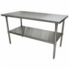 This work table features an 18-gauge T-304 stainless steel top, complete with turndown edges on all sides for added durability. Reinforced with channels, the table ensures stability and strength. It comes with an adjustable galvanized undershelf for convenient storage. The table is supported by four 1.63" diameter galvanized legs, each equipped with adjustable high-impact corrosion-resistant feet, providing a sturdy and reliable work surface.