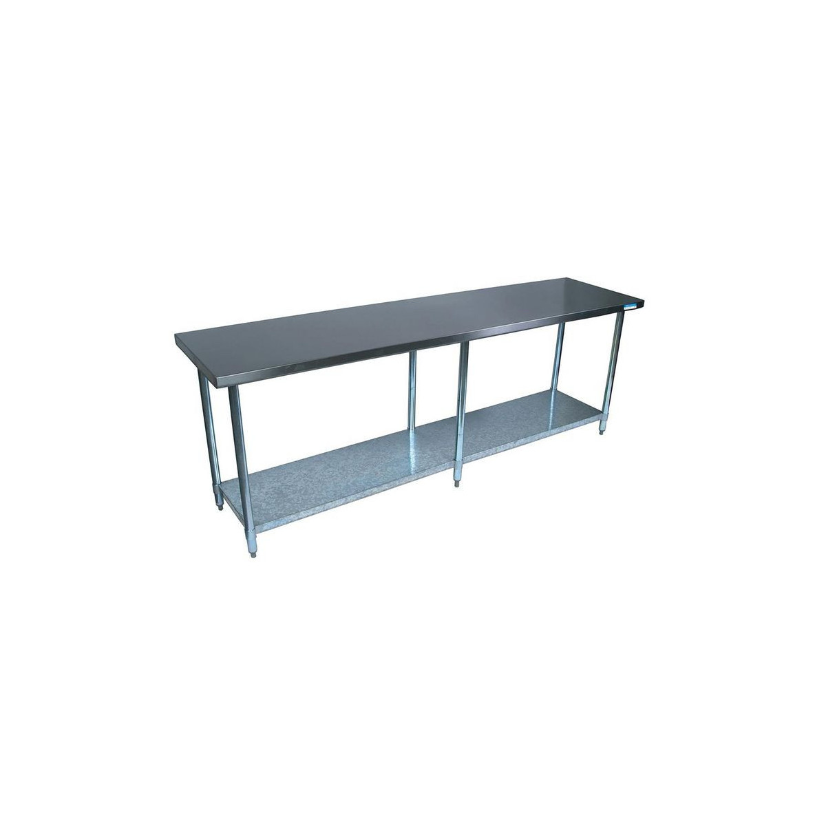 This work table features an 18-gauge T-304 stainless steel top, complete with turndown edges on all sides for added durability. Reinforced with channels, the table ensures stability and strength. It comes with an adjustable galvanized undershelf for convenient storage. The table is supported by four 1.63" diameter galvanized legs, each equipped with adjustable high-impact corrosion-resistant feet, providing a sturdy and reliable work surface.