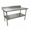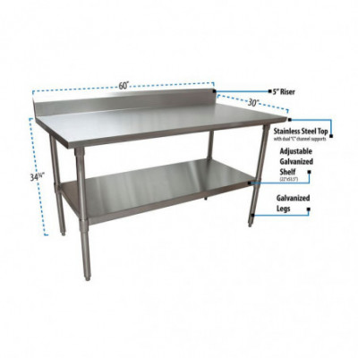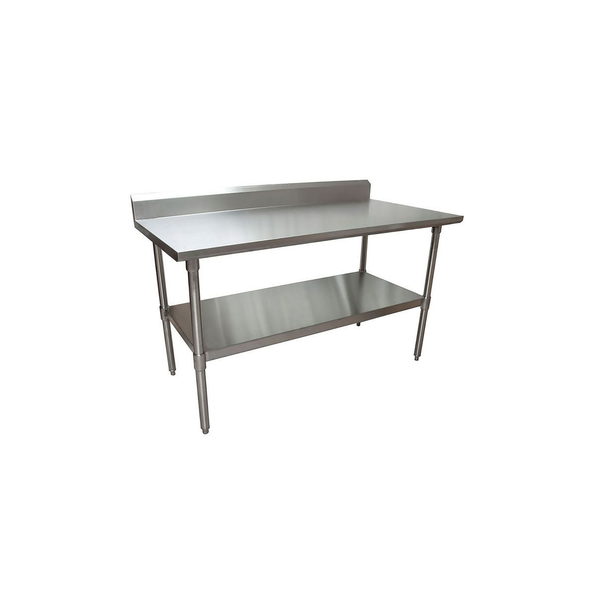 This work table boasts an 18-gauge T-304 stainless steel top, featuring turndown edges on the front and sides for enhanced functionality. Reinforced with channels, the table ensures robustness and durability. A 5-inch backsplash adds an extra layer of protection. The table comes equipped with an adjustable galvanized undershelf, providing versatile storage options. Supported by 1.63" diameter galvanized legs, each leg is fitted with adjustable high-impact corrosion-resistant feet, ensuring a stable and resilient work surface.
