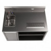 This beverage table is equipped with a robust 14-ga stainless steel top and an 18-ga stainless steel body, ensuring durability and longevity. It features a 14" x 10" sink with a BKF-4DM-5G-G gooseneck faucet for efficient water access. The stainless steel cabinet provides stable support, while a 5" riser backsplash incorporates a standard electric outlet for added convenience. The table includes a built-in urn trough with a drain to manage drips and spills effectively. A hinged door under the sink enhances accessibility, and an adjustable shelf offers additional storage flexibility.