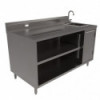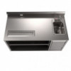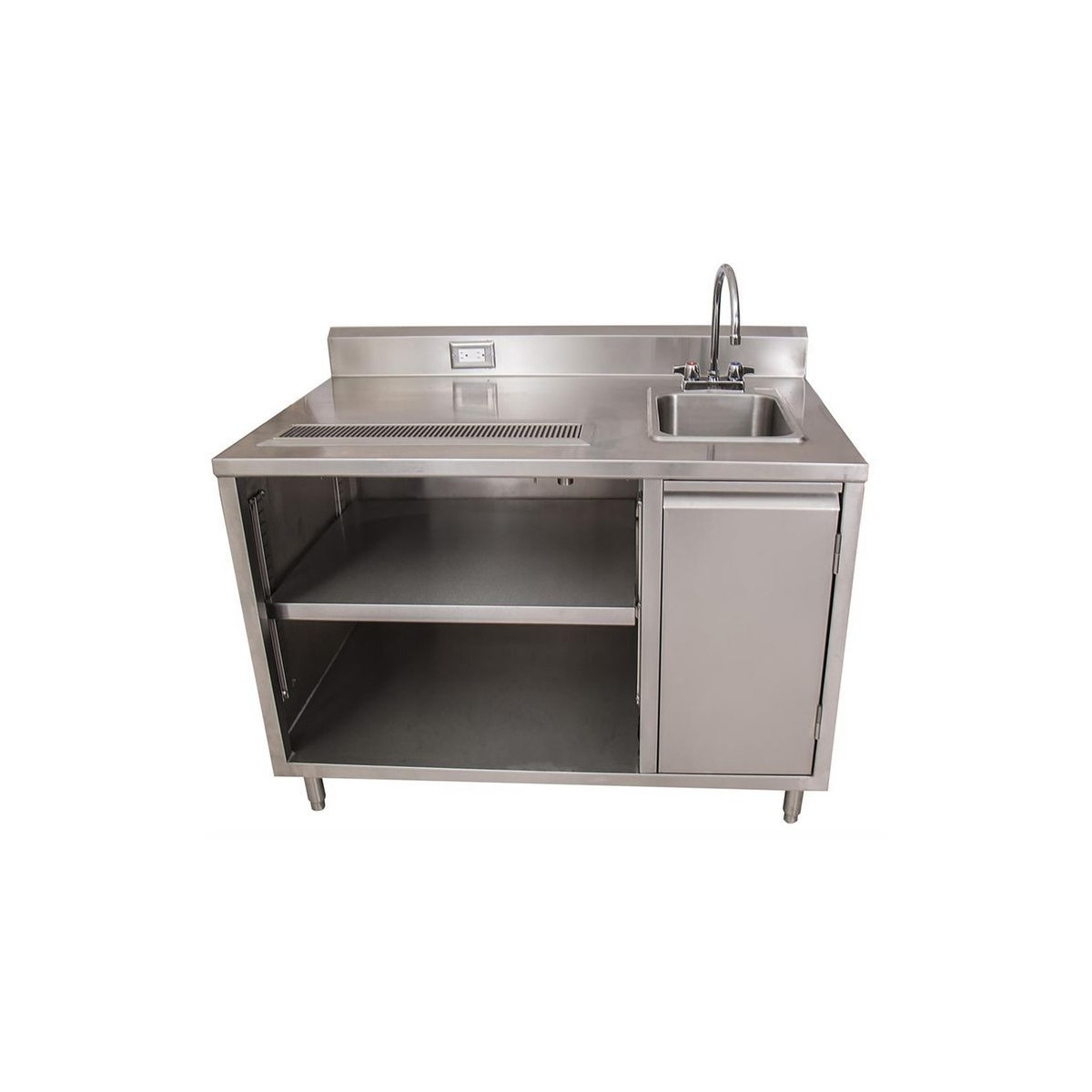 This beverage table is equipped with a robust 14-ga stainless steel top and an 18-ga stainless steel body, ensuring durability and longevity. It features a 14" x 10" sink with a BKF-4DM-5G-G gooseneck faucet for efficient water access. The stainless steel cabinet provides stable support, while a 5" riser backsplash incorporates a standard electric outlet for added convenience. The table includes a built-in urn trough with a drain to manage drips and spills effectively. A hinged door under the sink enhances accessibility, and an adjustable shelf offers additional storage flexibility.