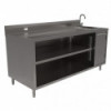 This beverage table is equipped with a robust 14-ga stainless steel top and an 18-ga stainless steel body, ensuring durability and longevity. It features a 14" x 10" sink with a BKF-4DM-5G-G gooseneck faucet for efficient water access. The stainless steel cabinet provides stable support, while a 5" riser backsplash incorporates a standard electric outlet for added convenience. The table includes a built-in urn trough with a drain to manage drips and spills effectively. A hinged door under the sink enhances accessibility, and an adjustable shelf offers additional storage flexibility.