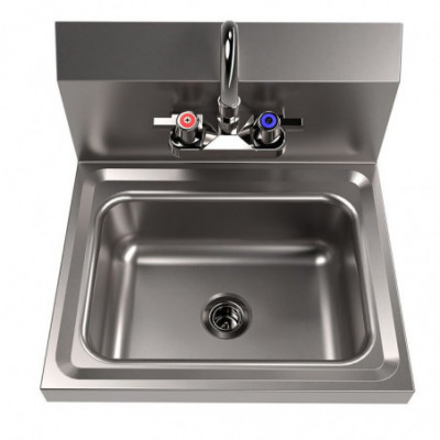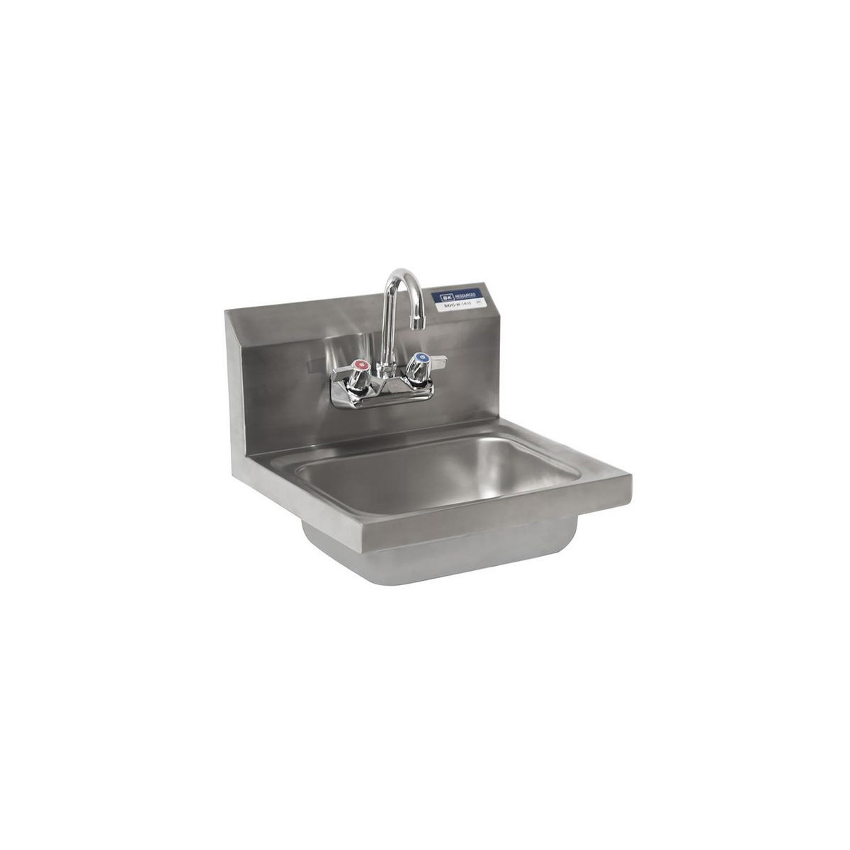 This wall-mounted hand sink, measuring 14" l x 10" w x 5" d in bowl size, is constructed from durable 304 stainless steel. It features 4" on center splash mount faucet holes, accompanied by a BKF-W-3G-G faucet for efficient water access. The sink includes a 1.88" drain opening, and both a basket drain and mounting bracket are provided for convenience. Meeting NSF standards, this hand sink ensures hygiene and quality in commercial settings.