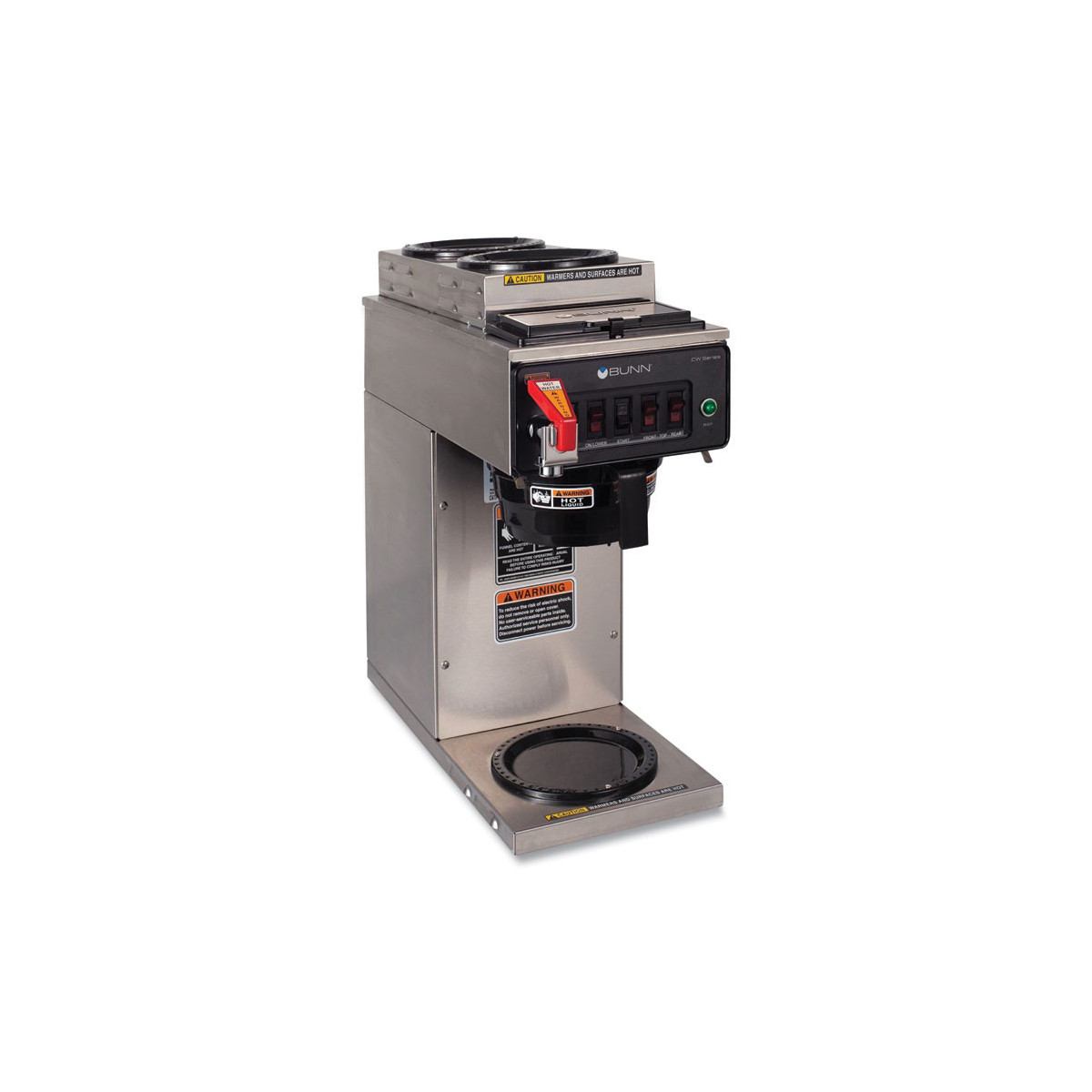 Plumbed, medium volume brewing solution with simple switch controls. Model is space-saving 8.5" wide. SplashGard® funnel deflects hot liquids away from the hand. Pourover backup feature. Hot water faucet (requires active plumbing connection). All stainless steel construction. Brews up to 3.9 gallons per hour. Two upper and one lower warmer for maintaining beverage temperatures. Brews directly into decanter (Decanters sold separately).