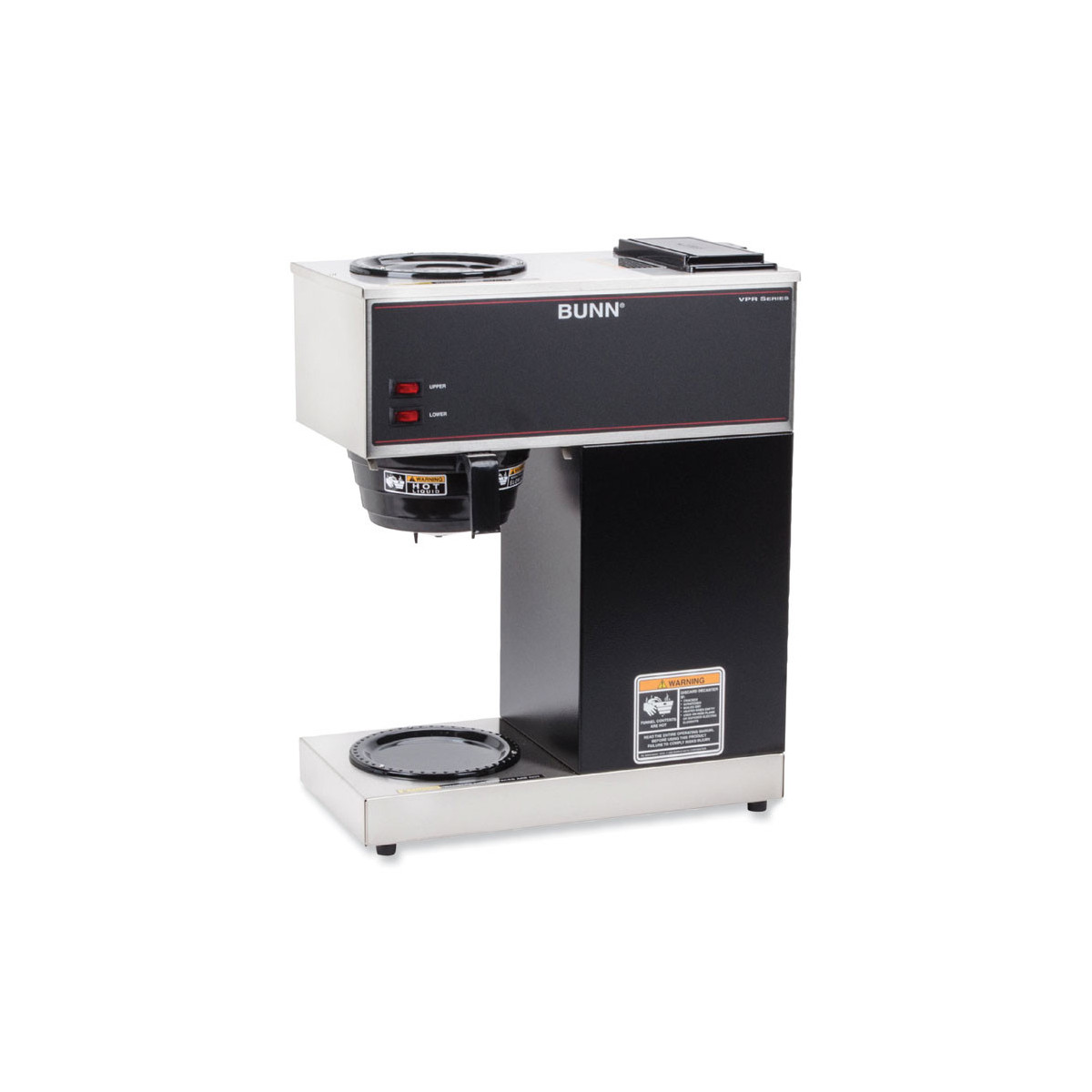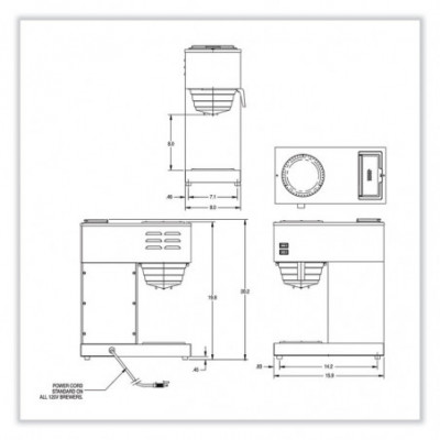 A simple switch design that requires neither plumbing nor special wiring. All stainless steel construction. Two individually controlled warmers. SplashGard funnel deflects hot liquids away from the hand. 12-cup glass decanters included. Pourover brewer requires no plumbing, completely portable. Just pour cold water in top and coffee brews immediately. Brews up to 3.8 gallons per hour.