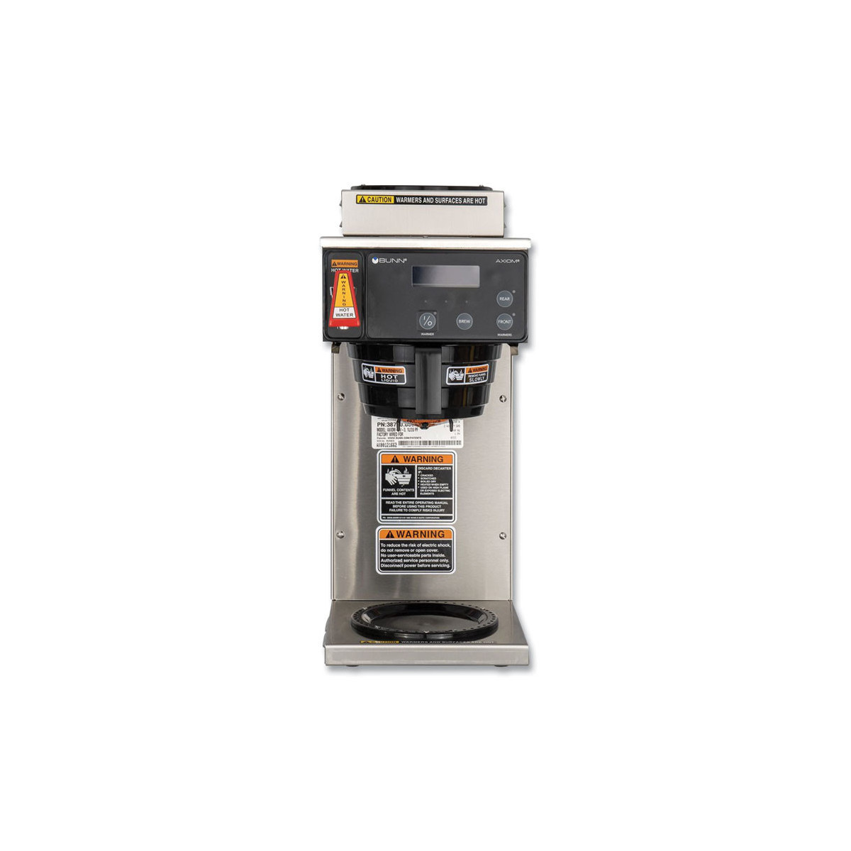 This dual voltage brewer provides a unique medium volume brewing solution for your office coffee or food service needs. This unit will hold three decanters of coffee on one lower and two upper warmers. The Axiom unit features Digital Brewer Control for precise extraction control resulting in the optimal flavor profile for an exceptional coffee experience. Hot water faucet feature for soups and other hot drinks.