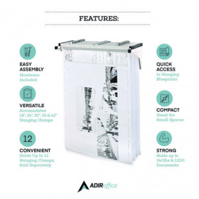 The AdirOffice Drop/Lift Wall Rack provides compact and convenient hanging storage in compact areas where space is limited. Just use hanging paper clamps to clip your blueprints, plan drawings, maps and other large files together, then put them in these handy, wall-mounted brackets to keep them organized and close at hand (clamps sold separately). Expertly constructed using solid steel, this wall rack will provide long-term durability and use for years to come. It boasts a 240-lb weight capacity and can hold up to 1,200 documents at once. It's furnished in a finish that will easily fit into and enhance any existing decor. This storage rack can fit any size paper clamps you choose depending on how far apart you install the brackets. Once the brackets are fixed, only one size clamp will fit. Mounting hardware is included for quick and easy installation on any wall. Due to the weight capacity, it's strongly recommended to attach the unit to wall studs or a solid surface. Once installed, clamps lift out and drop in for easy, convenient access to all of your stored documents, making your workplace efficient, organized and the best it can be.