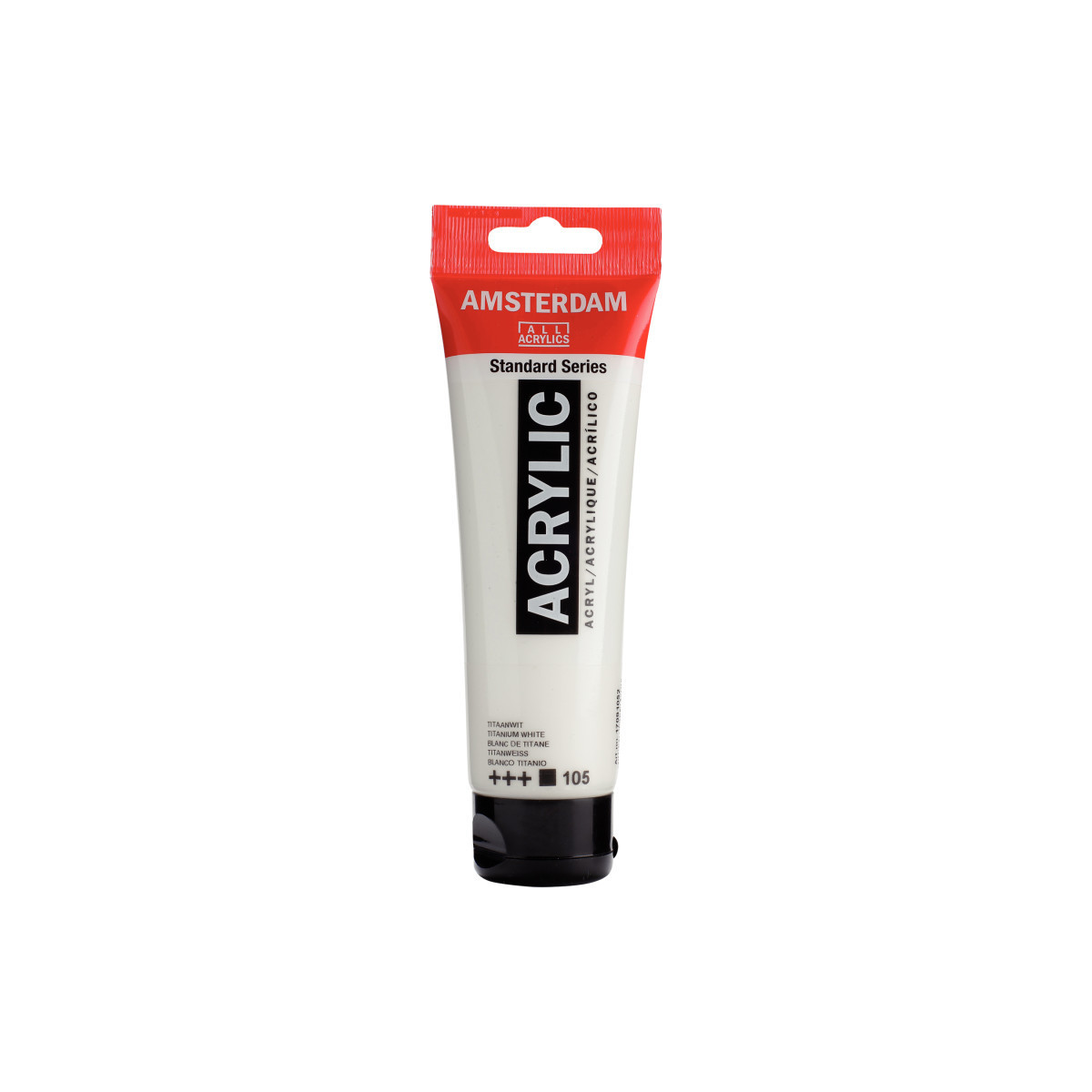 Amsterdam Standard Series acrylic paint in Titanium White (105) is an opaque color with an excellent lightfastness. Our Standard Series offers you the broadest range of remarkably vibrant acrylic colors. This versatile paint is easy to work with and offers a smooth application. Use the paint straight from the tube or thinned with a little bit of water or one of our acrylic mediums. Medium viscosity paint for visible brush strokes, texture and smooth coverage with a satin finish. Made with high-quality, lightfast pigments. Formulated with 100% acrylic resin binder, resulting in an exceptionally durable and flexible paint film with a uniform degree of gloss. Odorless, water-based formula that becomes waterproof and permanent when dry.