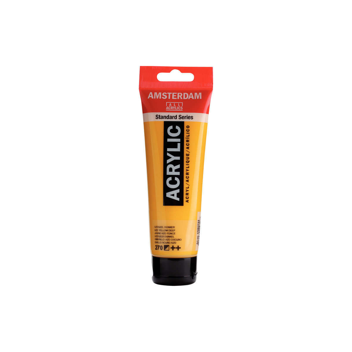 Amsterdam Standard Series acrylic paint in Azo yellow deep (270) is a semi-opaque color with a very good lightfastness (++). Our Standard Series offers you the broadest range of remarkably vibrant acrylic colors. This versatile paint is easy to work with and offers a smooth application. Use the paint straight from the tube or thinned with a little bit of water or one of our acrylic mediums. Medium viscosity paint for visible brush strokes, texture and smooth coverage with a satin finish. Made with high-quality, lightfast pigments. Formulated with 100% acrylic resin binder, resulting in an exceptionally durable and flexible paint film with a uniform degree of gloss. Odorless, water-based formula that becomes waterproof and permanent when dry.