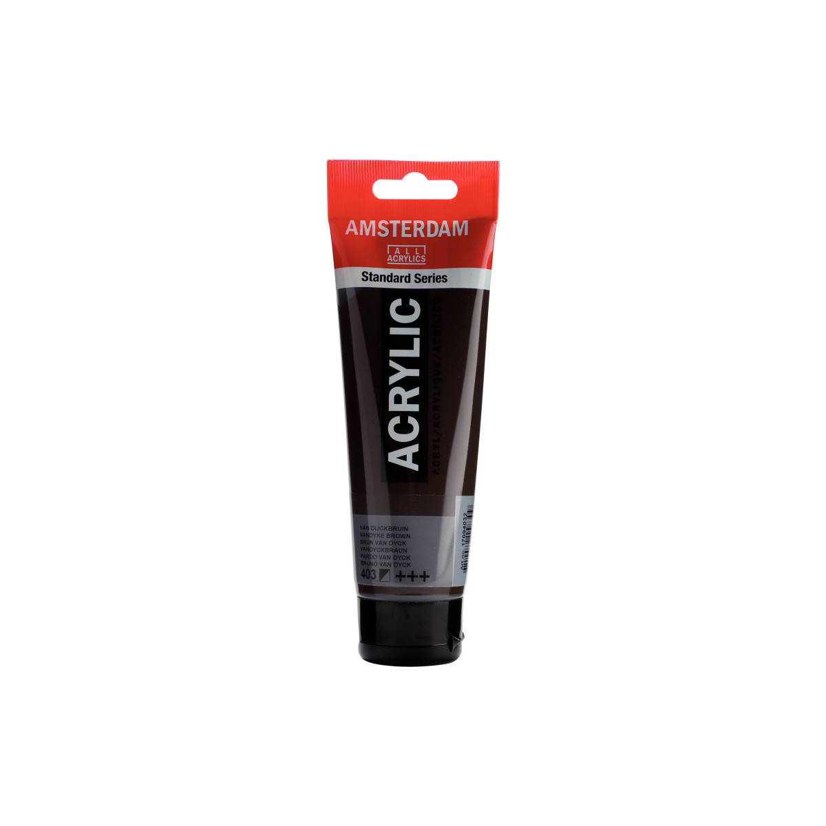 Amsterdam Standard Series acrylic paint in Vandyke Brown (403) is a semi-opaque color with an excellent lightfastness. Our Standard Series offers you the broadest range of remarkably vibrant acrylic colors. This versatile paint is easy to work with and offers a smooth application. Use the paint straight from the tube or thinned with a little bit of water or one of our acrylic mediums. Medium viscosity paint for visible brush strokes, texture and smooth coverage with a satin finish. Made with high-quality, lightfast pigments. Formulated with 100% acrylic resin binder, resulting in an exceptionally durable and flexible paint film with a uniform degree of gloss. Odorless, water-based formula that becomes waterproof and permanent when dry. Extensive range of 102 colors available in 20ml and 120ml tubes, of which up to 90 colors are also available in larger sizes. The range of colors includes both traditional and modern colors such as reflex and metallic variants. Adheres to virtually any slightly porous surface, including canvas, paper, cardboard, wood, stone and cement. Proudly crafted in the Netherlands.