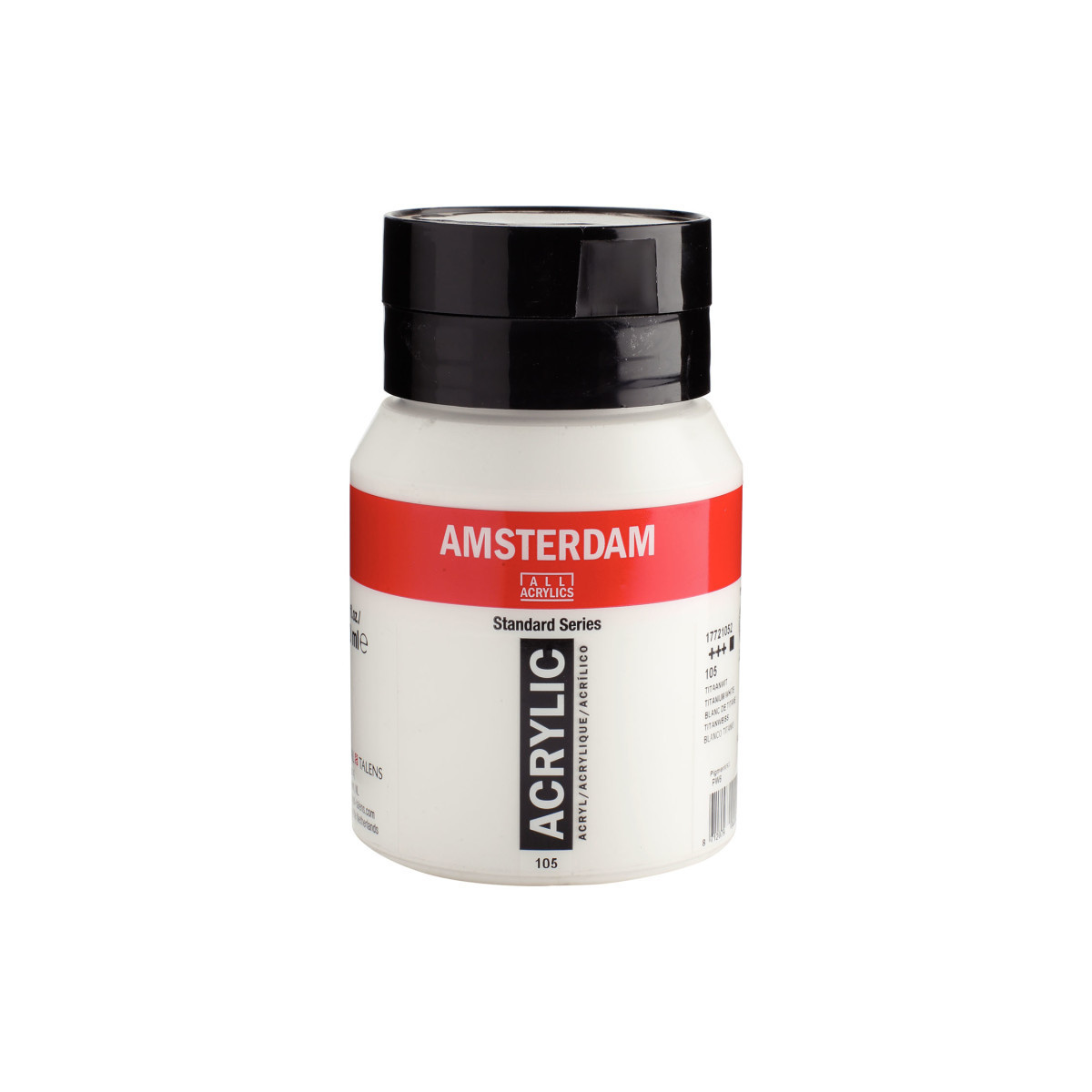 Amsterdam Standard Series acrylic paint in Titanium White (105) is an opaque color with an excellent lightfastness. Our Standard Series offers you the broadest range of remarkably vibrant acrylic colors. This versatile paint is easy to work with and offers a smooth application. Use the paint straight from the tube or thinned with a little bit of water or one of our acrylic mediums. Medium viscosity paint for visible brush strokes, texture and smooth coverage with a satin finish. Made with high-quality, lightfast pigments. Formulated with 100% acrylic resin binder, resulting in an exceptionally durable and flexible paint film with a uniform degree of gloss. Odorless, water-based formula that becomes waterproof and permanent when dry.
