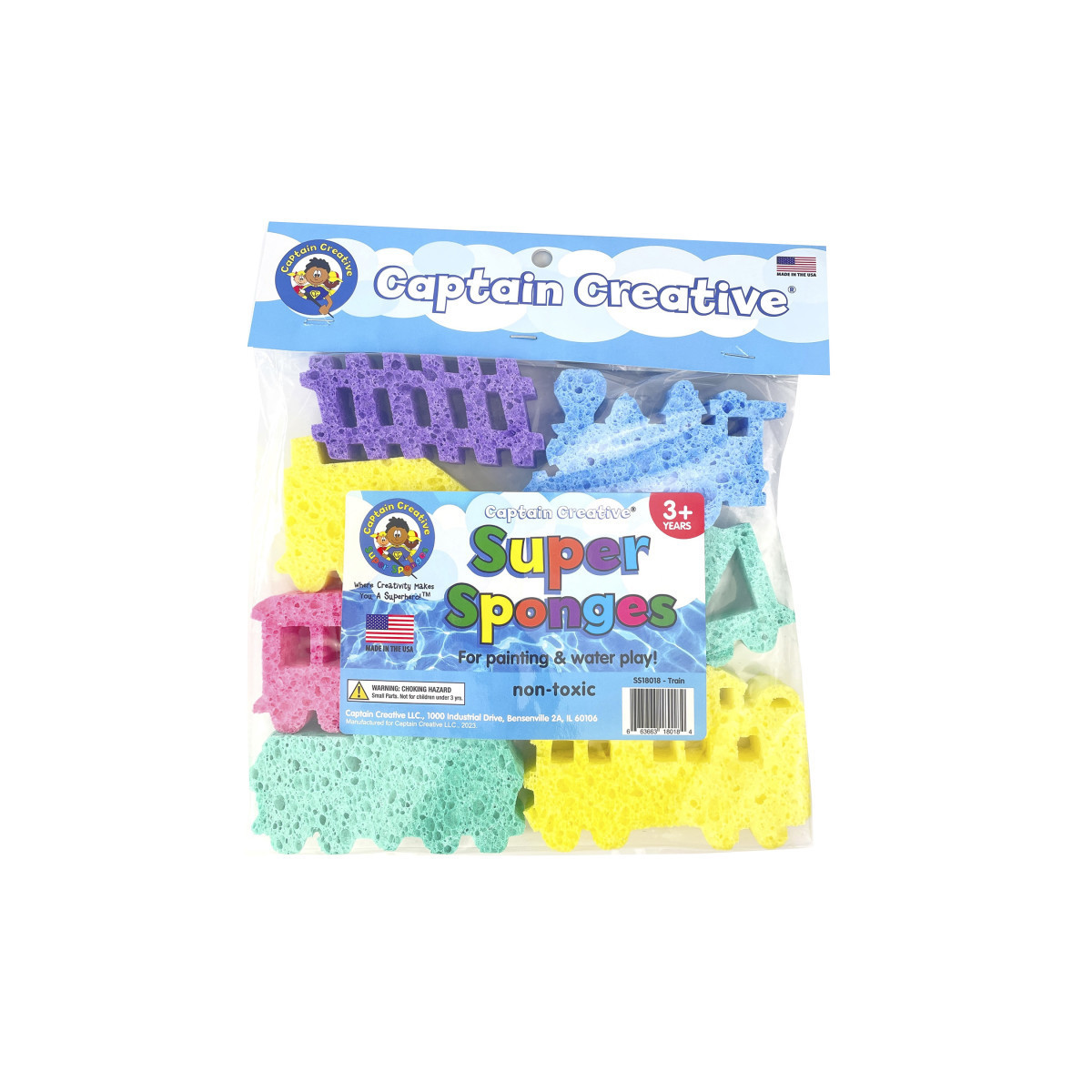 Captain Creative Super Sponges are a fun and functional addition to any classroom, art room, or play space. Made in the USA from high-quality, real cellulose material, these durable sponges are 1" thick and perfect for sponge painting, sand and water tables, and water play. The Train Pack includes a variety of die-cut shapes, with variations in color and quantity that make each set unique—while still delivering consistent quality and value. Designed for creative exploration, these sponges are not recommended for children under 3 years old, and adult supervision is advised for safe, engaging play.